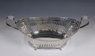 ajour schuitvormig model met blad, ovale en spijltjes motieven, vleugelvormig grepen aan weerskanten staand op vier klauwpootjes, mt. onduidelijk, 2e gehalte,