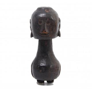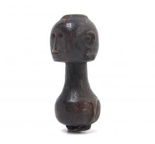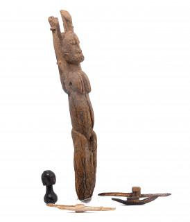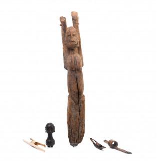 Three Asmat bone nose ornaments, Moluccas, a wooden amulet and Mali, wooden figure.