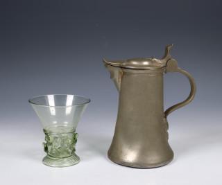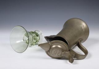 Een tinnen klepkan, gedateerd 1741 en een museum editie (kopie), groenglazen roemer