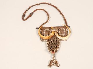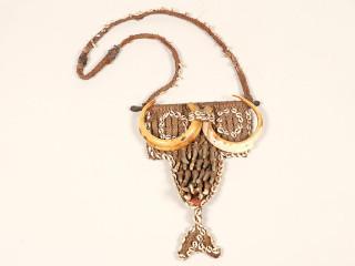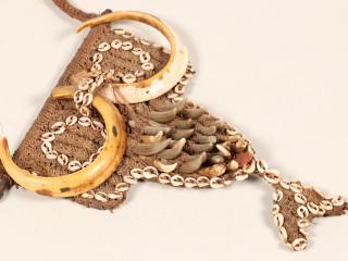 P.N.G., Lower Sepik, Watum Lagoon, pectoral, two boar's tusks and nassa shell attached to a braided plant fibre panel, on the lower part dog's teeth and Meissen grey porcelain teeth are attached.