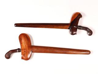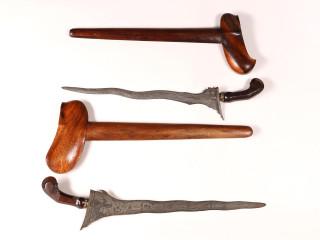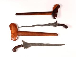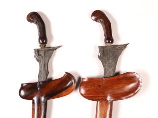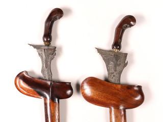 both with a slightly undulating wrought iron pamor pattern, filigree gilded silver mendaks, one set with glass stones.