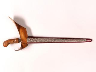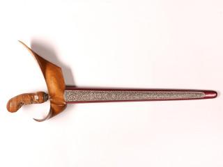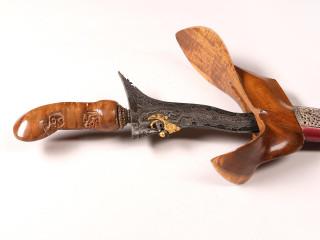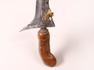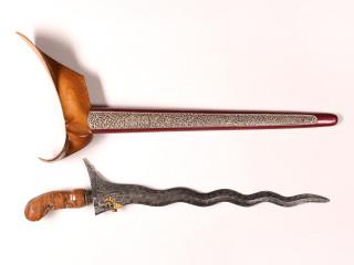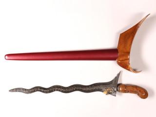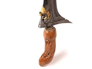 nine luk pamor iron blade, the sorsoran showing a crowned and gold overlaid Naga with a golden ball, straight ganja. Hilt and pendok natang modern.