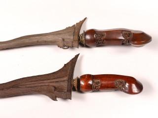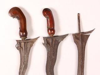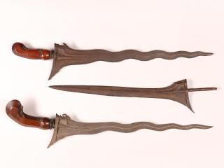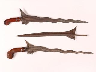 Java, Surakarta and a Yogyakarta, kris, the nine luk pamor iron blade, the bottom part with gajah trunk and labe, sogokan, straight ganja, wooden hilt and brass mendak, the other with 11 luk pamor iron blade, indistinct sekar kacang, wooden hilt, brass me
