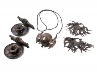 India, a pair silver alloy ear ornaments, Golden Triangle, a pair of silver alloy earrings and India a silver alloy lingam cascet on a chain.