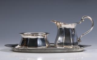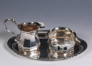 ovaal gecontourneerd blaadje, gefacetteerde roomkan en suikerbakje, 830 gemerkt en V Buitlenlandse werken 1806-1953, mogelijk samengesteld, blad getekend mt. Gottlieb Kurz Schwäbish Gmünd opgericht 1895,