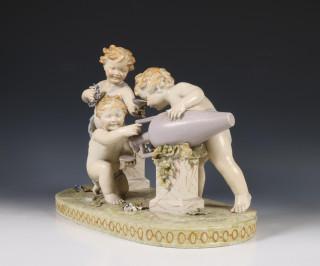 Voorstellende door druiventrossen omringde putti met amfoor bij marmeren zuil. Geheel geplaatst op ovale basis. Gemerkt met gekroond merk.