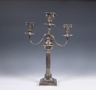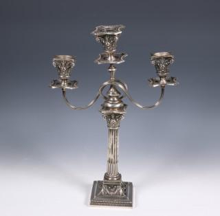 vierkanten basis met Korintische kapiteel op een gecanneleerde zuilvormige stam, de kaarsenhouders verbonden door gebogen armen met idem kapiteelvormige houder, gecontourneerde vetvangers en bobeches, gemerkt 800, mt. onduidelijk,