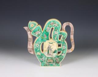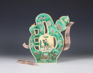 modelled as a Shou character, the central panel decorated with Immortals, surrounded by prunus and chrysanthemum on a green ground (handle broken but available, small nick to spout)