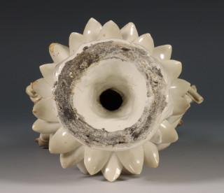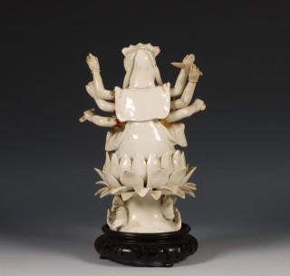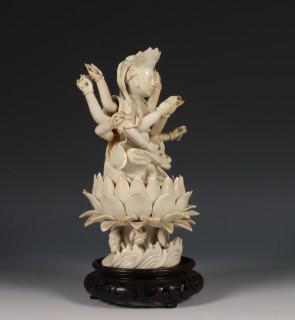 China, blanc-de-chine figure of Avalokiteshvara, 20th century, seated on a lotus throne and with six pairs of hands, of which three radiating holding various attributes and two in mudra's (condition: various chips and repairs to lotus petals, some arms restuck and with some losses)