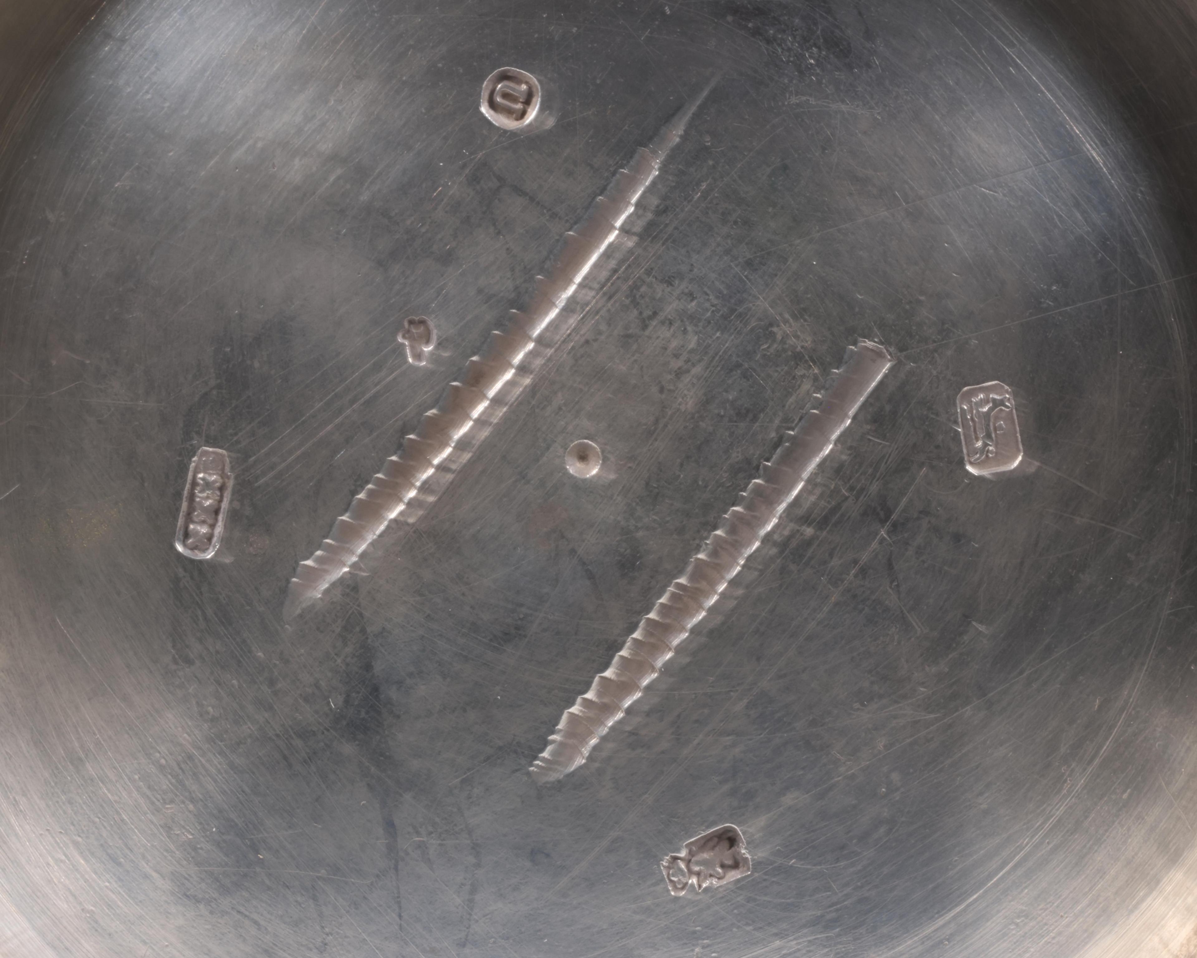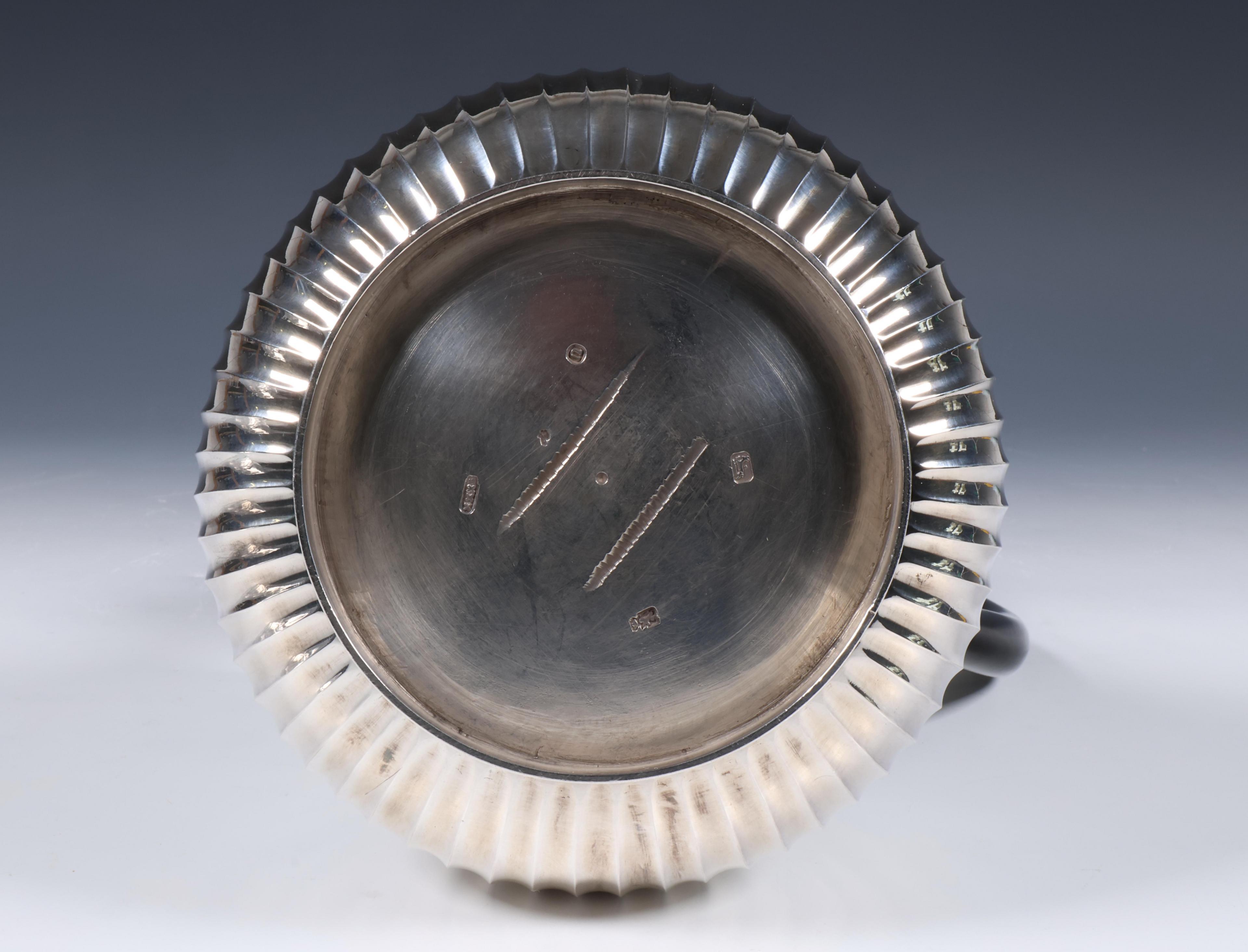 gecanneleerde bolle onderzijde en gewelfde scharnierende deksel met dennenappelvormige knop en ebbenhouten vleugelvormige greep, mt. J.A. de Haas Amsterdam 1803, deksel hersteld,