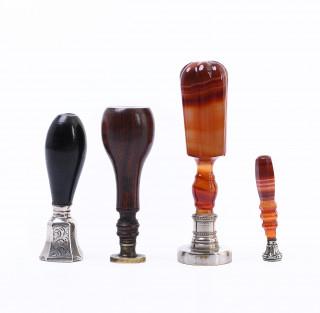met heften van hout en streepagaat. De kleinste stempel met een signet van zwarte streepagaat met gegraveerde vogel. De anderen met monogram,