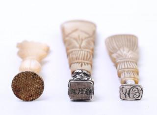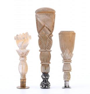 alle met een parelmoeren heft, waarvan één in de vorm van een handje. Twee met zilveren cachet met monogram, één met een cachet van koper,