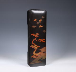 decorated in red and gilt maki-e with birds flying above a tree (wear, small damages)