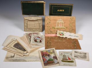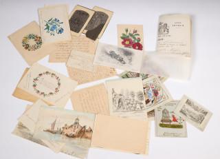 Met handgeschreven gedichten in schoonschrift, aquarellen en tekeningen. Hierbij zijden geborduurd mapje met spreuk, 1800 e.a.