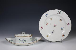 gedecoreerd met bloemen, gemerkt in onderglazuur blauw. Hierbij een vloot op spitsovale ondreschotel, gedecoreerd met korenbloemen, niet gemerkt. (bord met chip, en vloot met haarlijn)