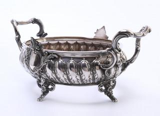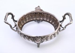 gelobd, ovaal en versierd met twee opstaande voluutvormige oren, getekend Kopenhagen 1862 waarschijnlijk, essayeur Simon Groth (1863-1904) 830, glazen binnenbak ontbreekt,