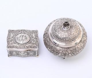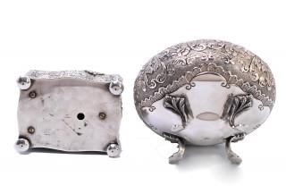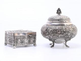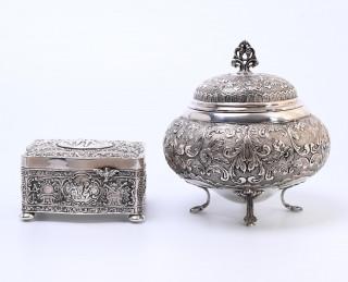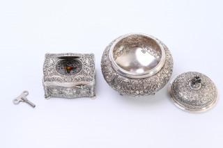 gecontourneerd rijk versierd met o.a. acanthusbladmotieven en voorstelling in medaillons van musicerende putti, gemerkt sterling 925, met sleutel niet lopend, en ronde koektrommel met deksel op vier gebogen pootjes gemerkt o.a. Prata 833