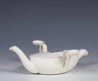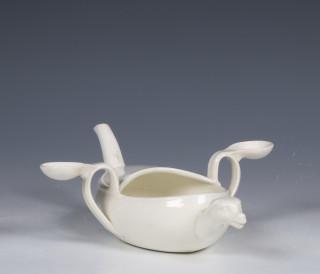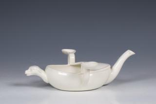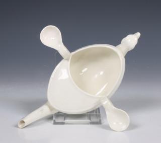 schuitvormige kan met twee lepels weerszijde, de greep in de vorm van een hondenkop. Ook wel invalid feeder of physic cups genoemd.