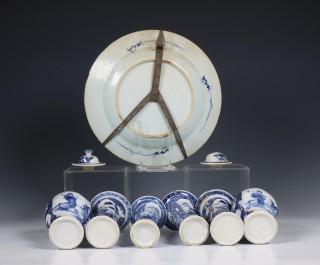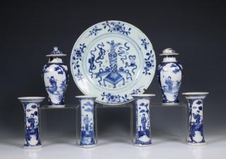 bestaande uit een vierdelig kaststel, een paar cilindrische vazen en een bord (alle defect)