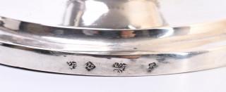 op ronde voet voet, gelobde ronde gehamerde kaarsenhouders, met bladvormige vetvangers en ronde stam versierd met rand met versierd bladmotieven, mt, VM(niet geïdentificeerd), stadskeur RFV 13, V en buitenlandse werken 1906-1953