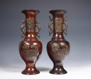 modelled in relief with birds and flowers, the long necks applied with twin dragon handles (one with resoldered base, both with surface wear)