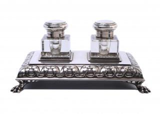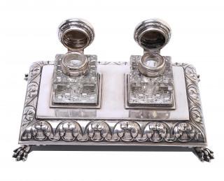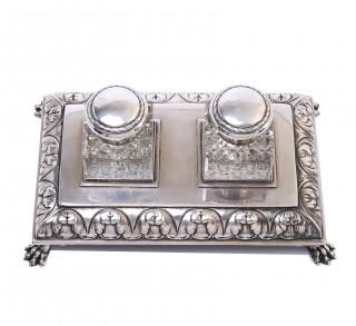 Denemarken, inktstel met kristallen potten met zilveren scharnierende doppen, Jugendstil,