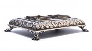 rechthoekig op vier klauwpootjes met gestileerde acanthusbladmotieven, vierkanten potten, mt. essayeru Christian F. Heise 1904-1932, Kopenhagen 1914, doppen gemerkt 830 S, mogelijk samengesteld,