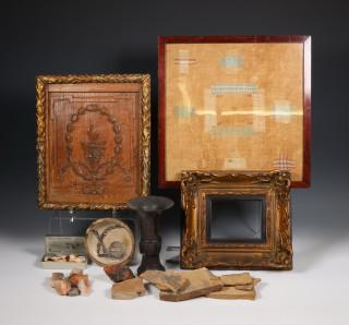 w.b. houten paneel met gestoken guirlande en schelpen.