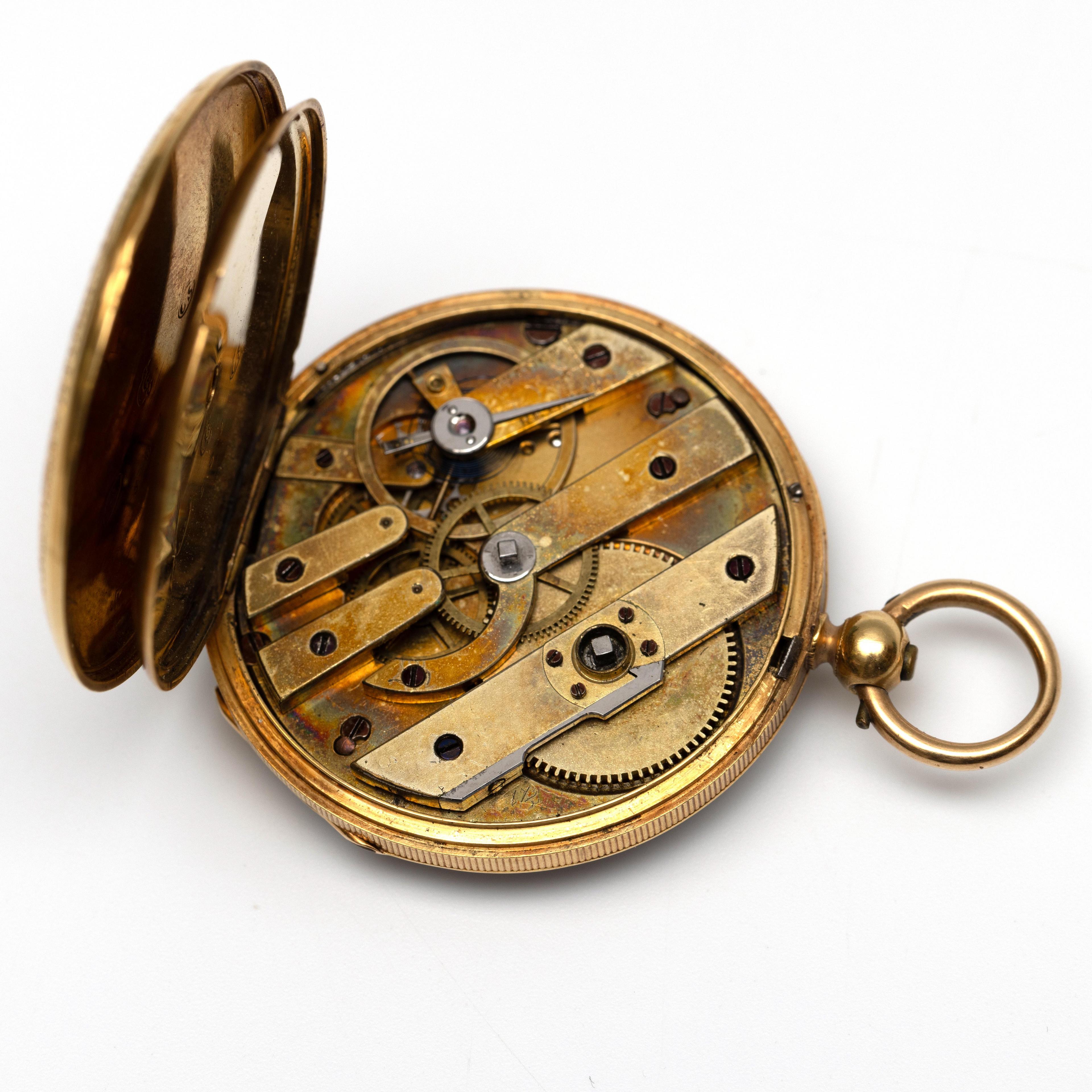 18 k. gold fob watch, 19th century. The back with a decor of leaves and decorated with light blue and white enamel. With gold inner lid