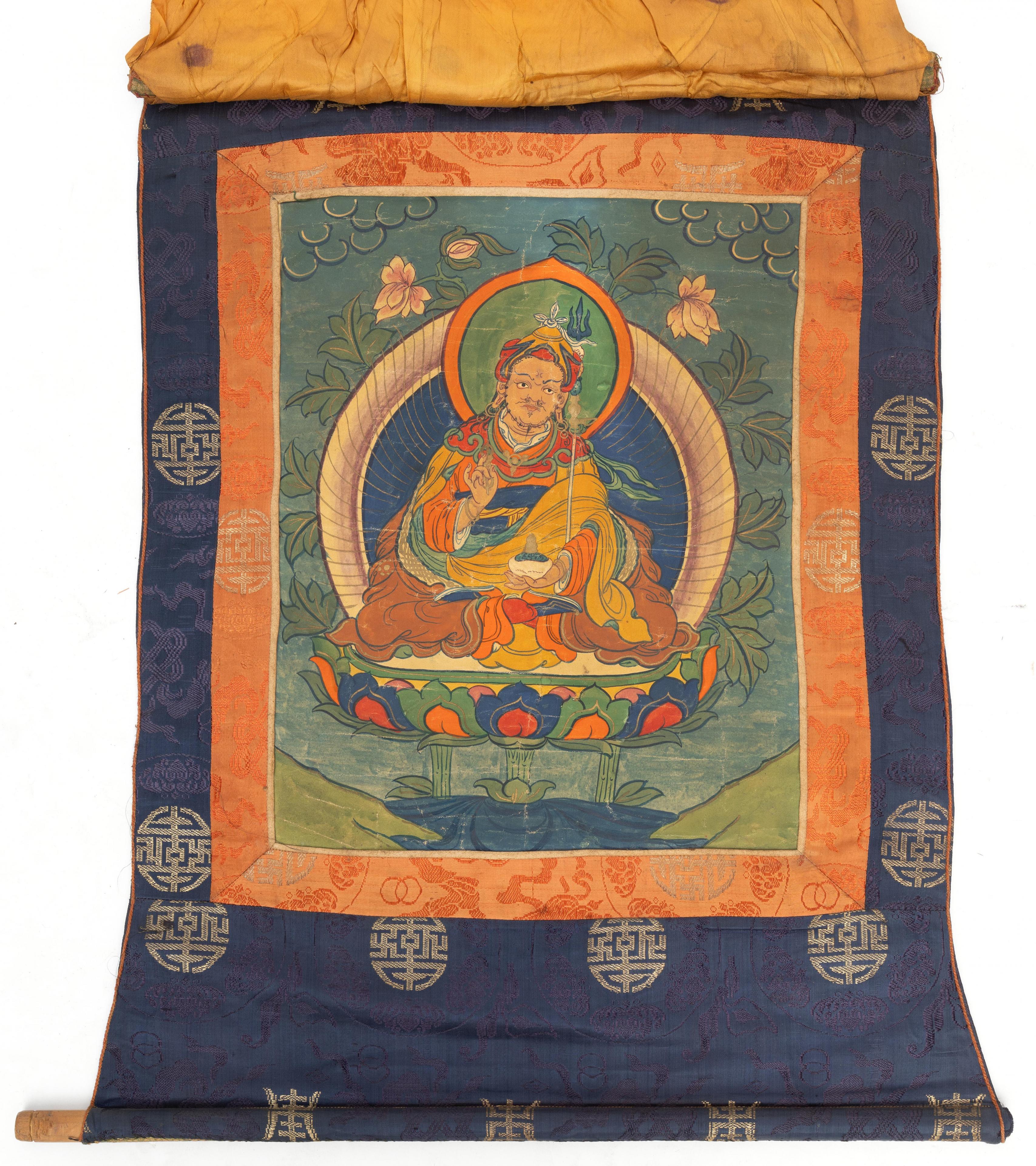 seated on a lotus throne and surrounded by lotus (some creases and wear)