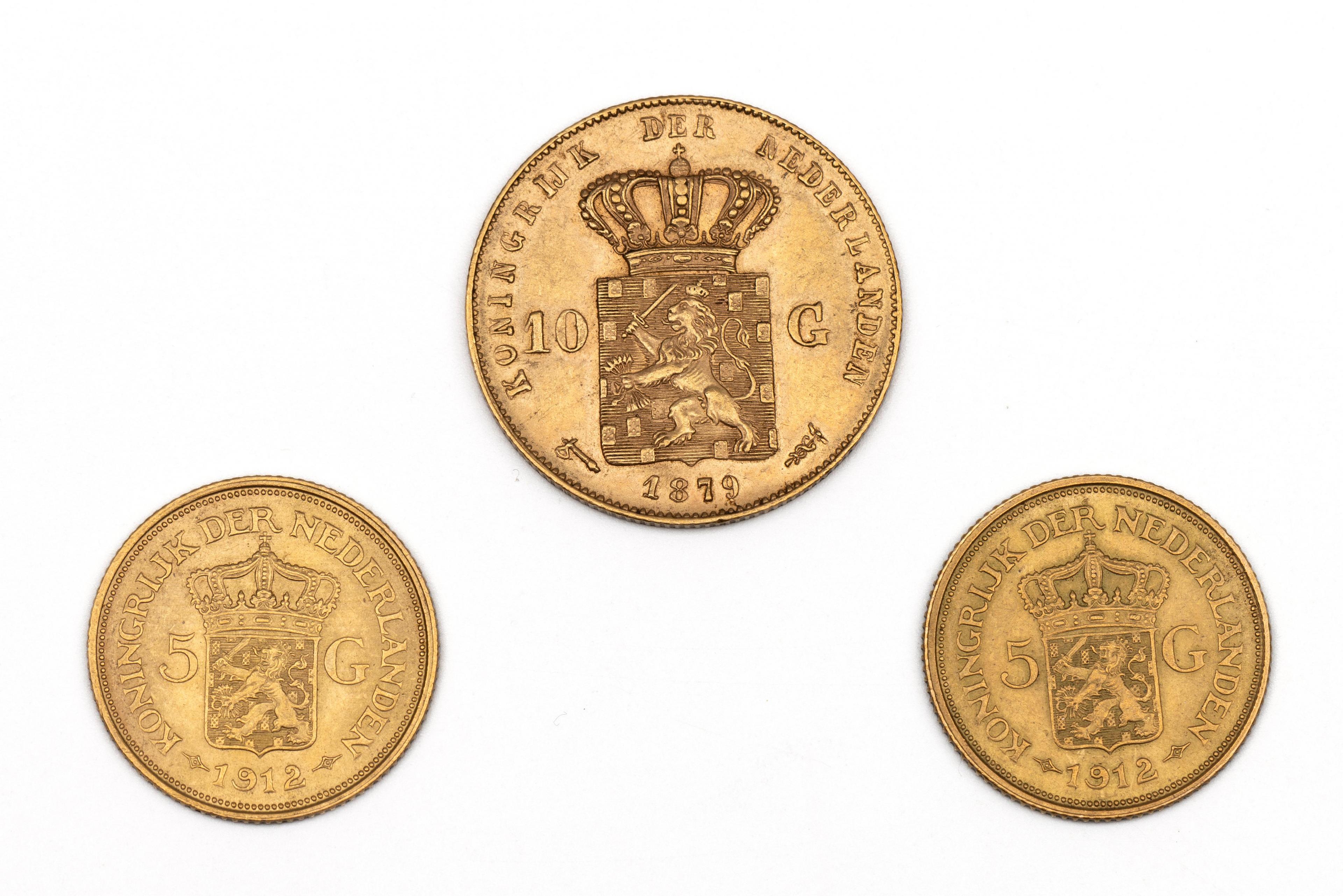 Three gold coins. Two golden fives with Wilhelmina, 1912 and a golden tenner with Willem III, 1879