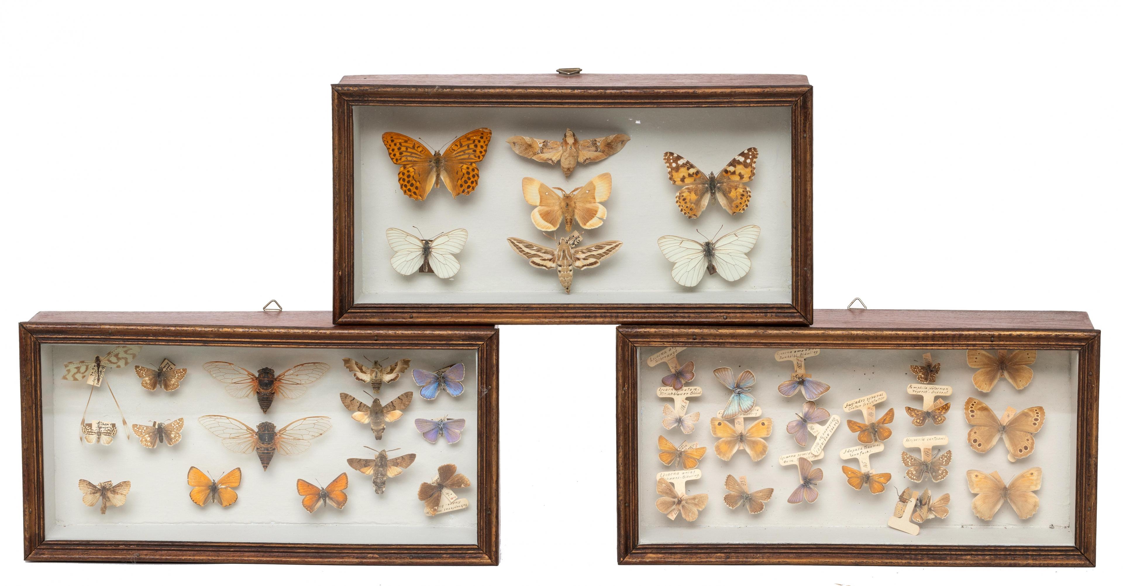 Taxidermy, geprepareerde vlinders in drie houten wandvitrines, ca. 1950;