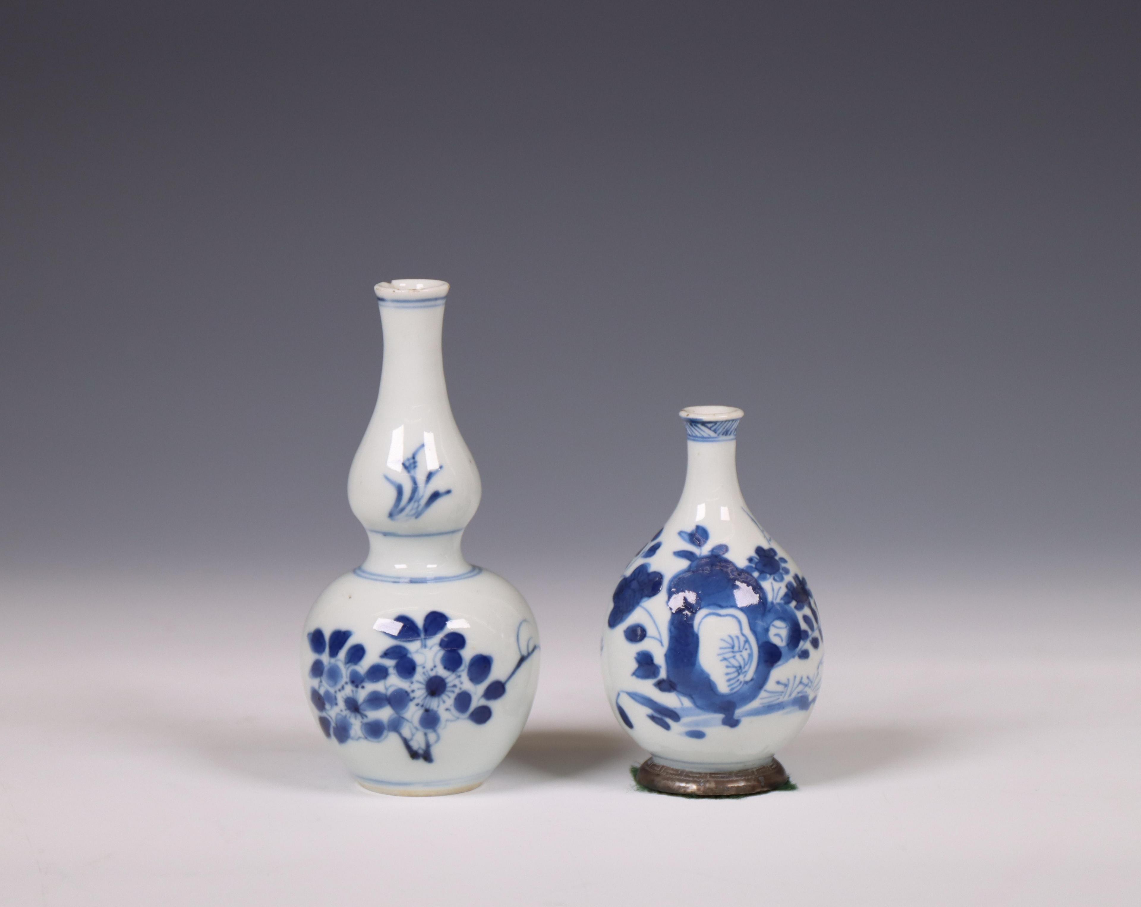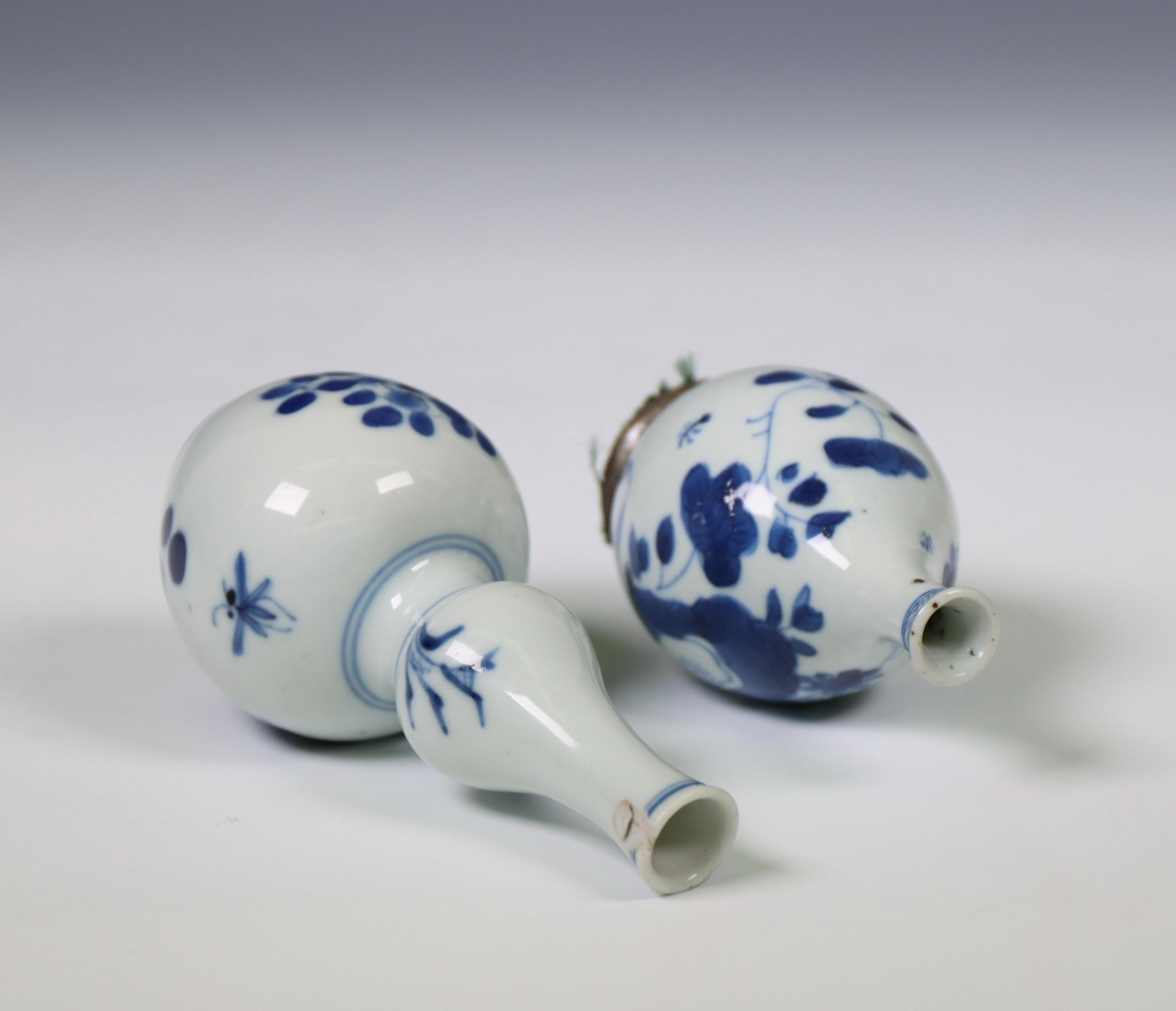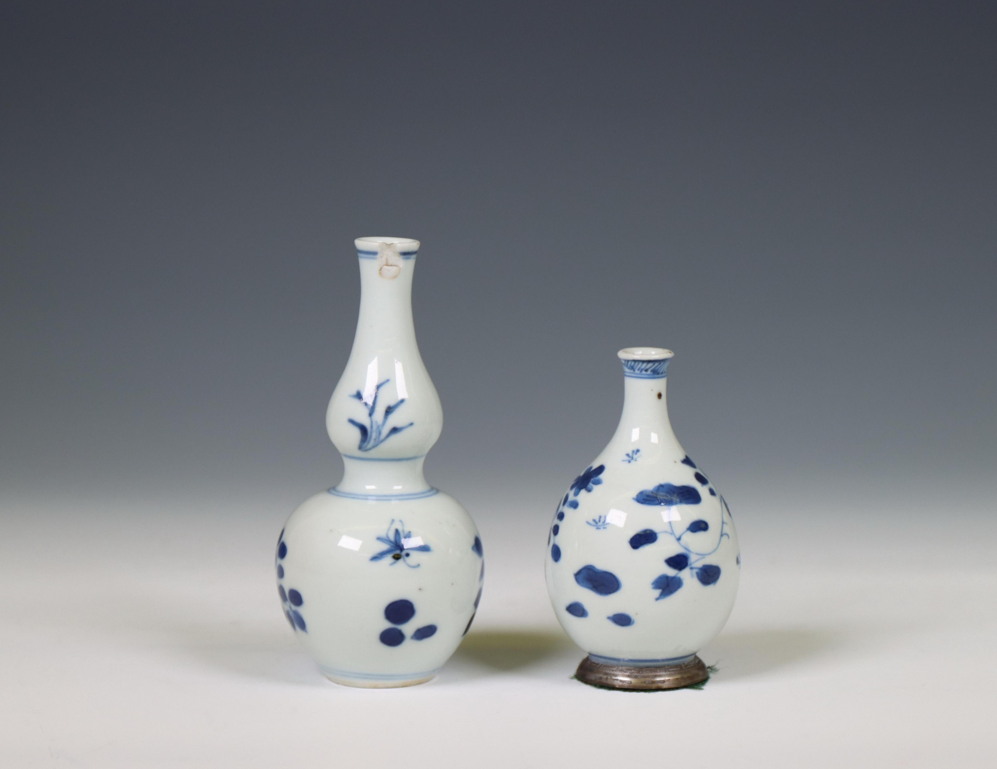 one of double-gourd shape and the other pear-shaped and with later silver foot mount, both decorated with flowers (the double-gourd with grazed rim chip of 1 x 0.5 cm and a small related hairline to the interior neck, the other with minor glaze flaws)