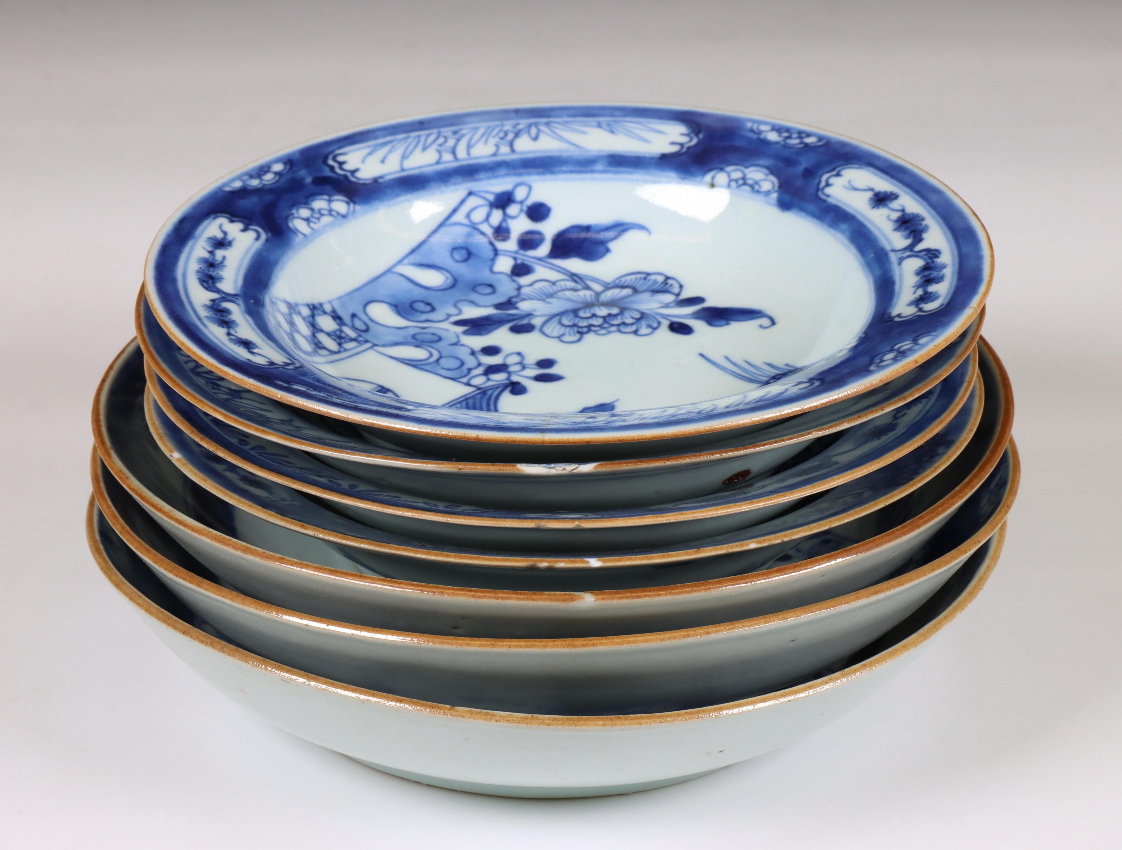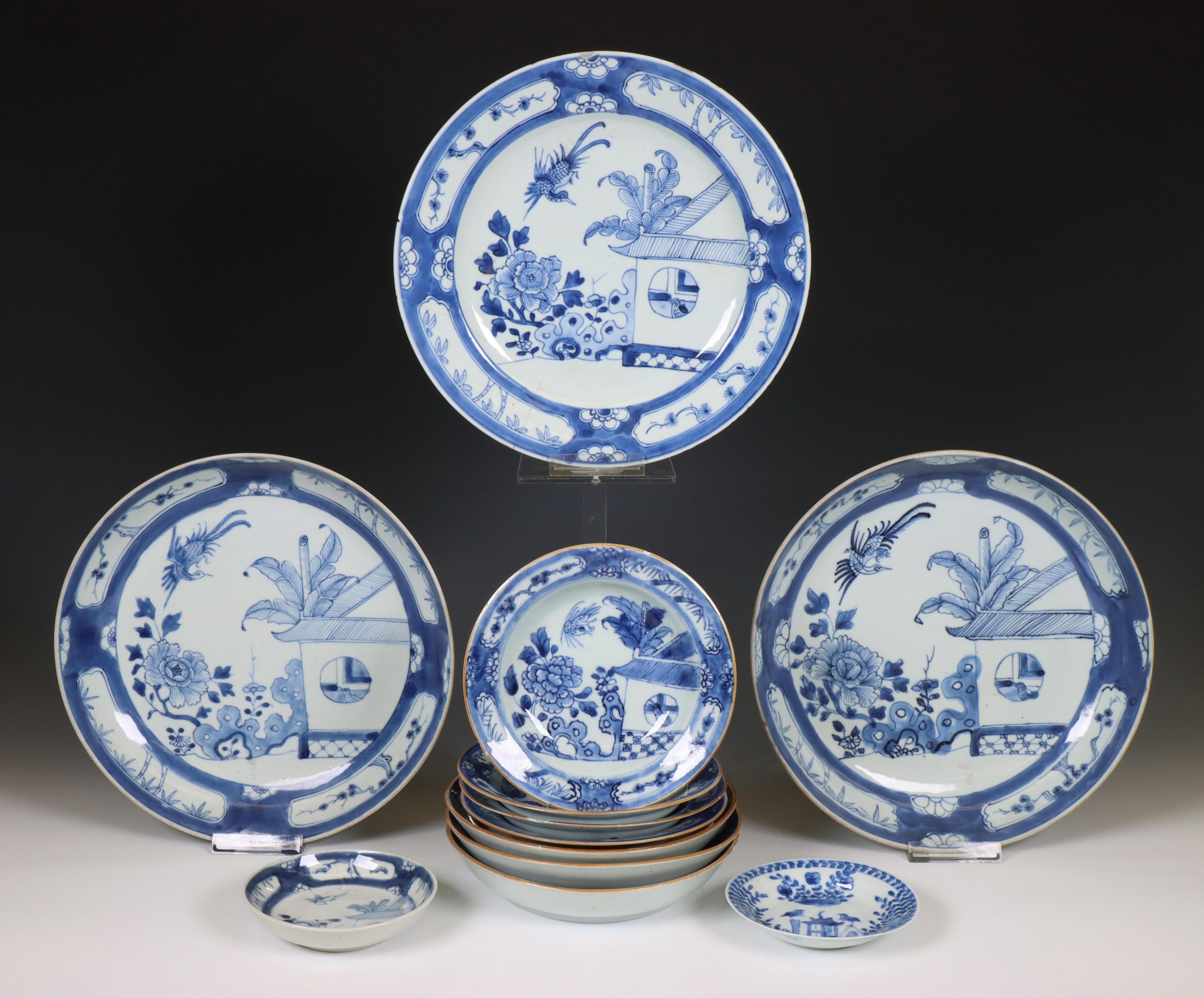 China, a collection of blue and white porcelain 'Cuckoo in the House' dishes, 18th century,