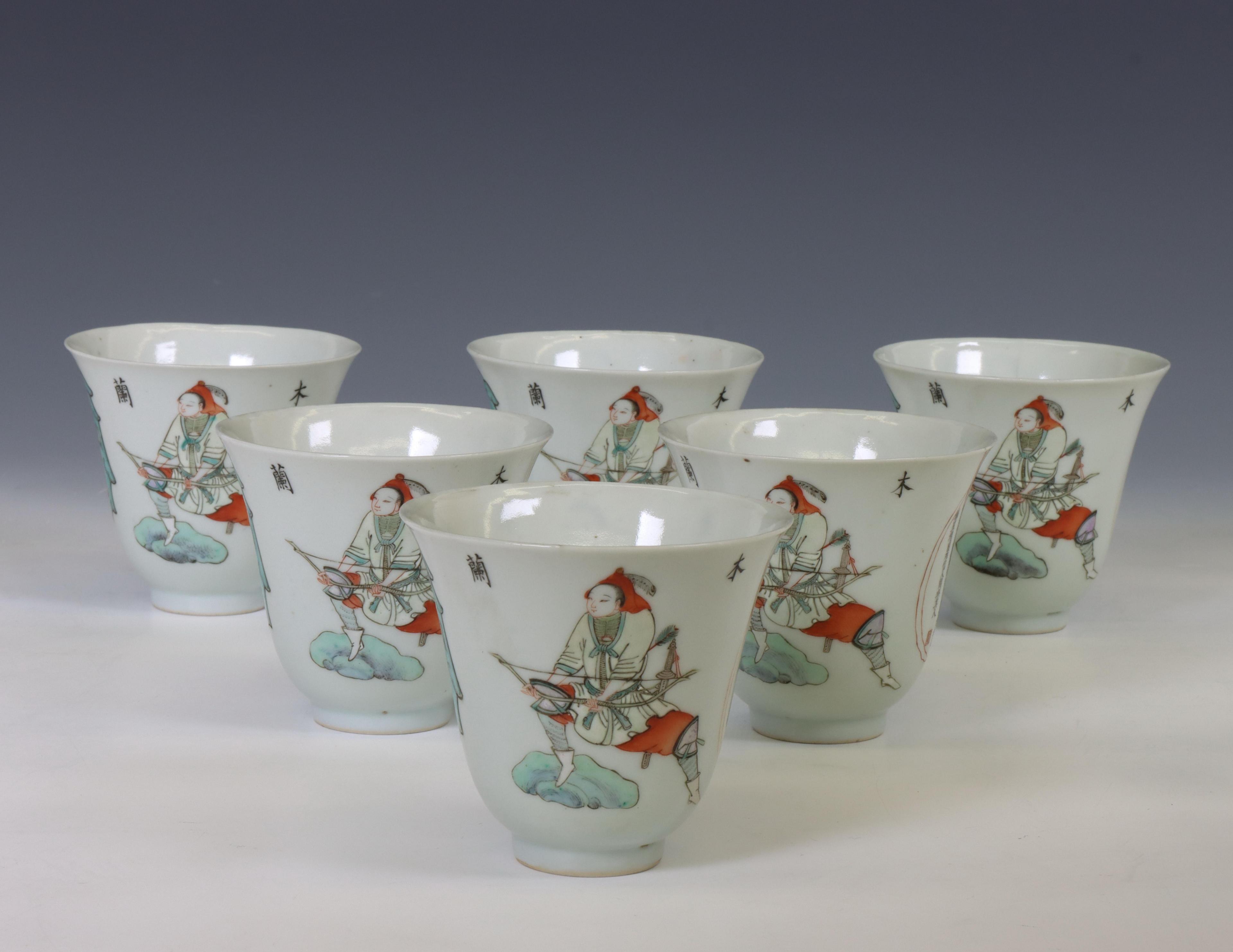China, a set of six famille rose porcelain 'Wu Shuang Pu' cups, 20th century,