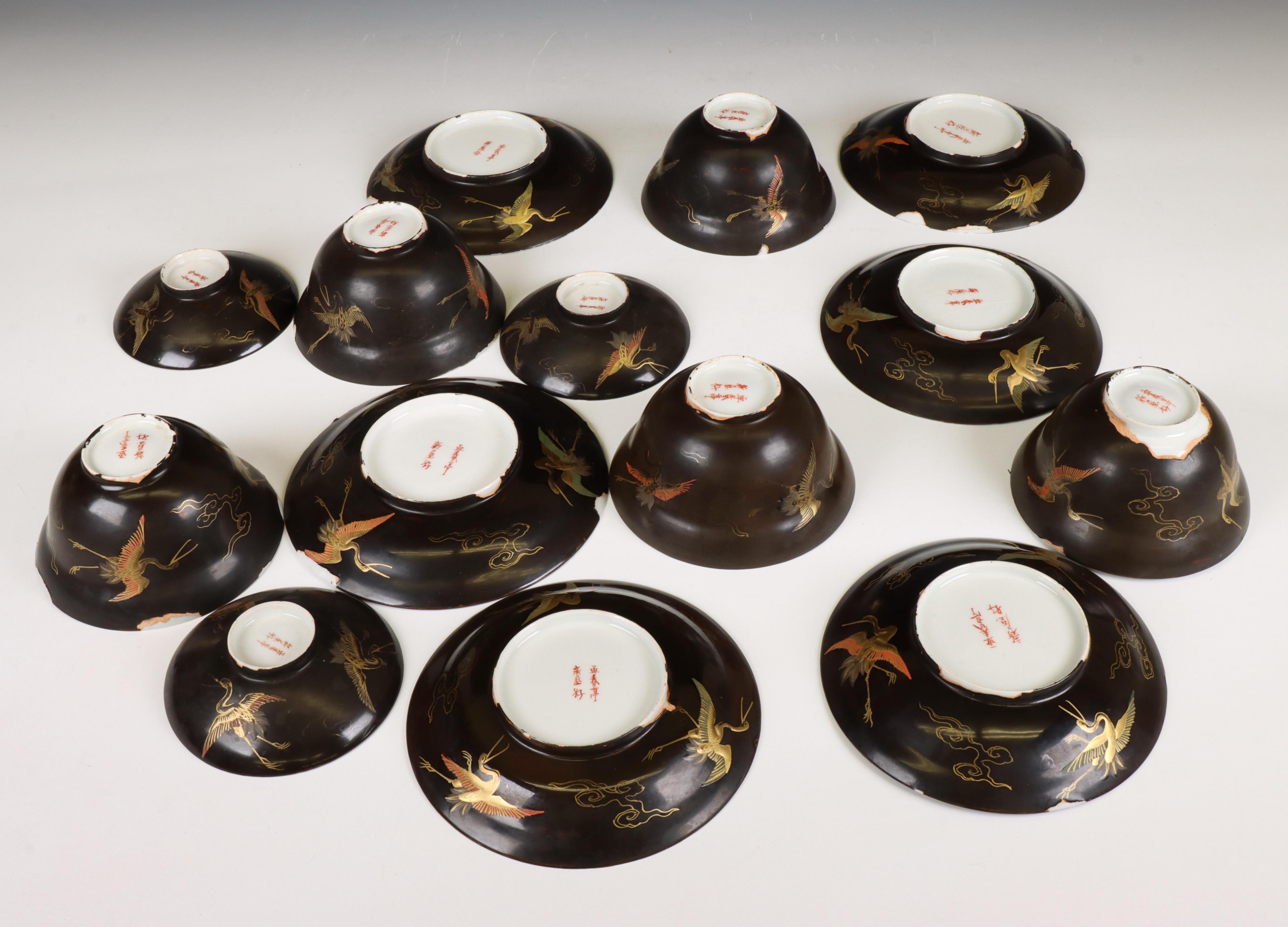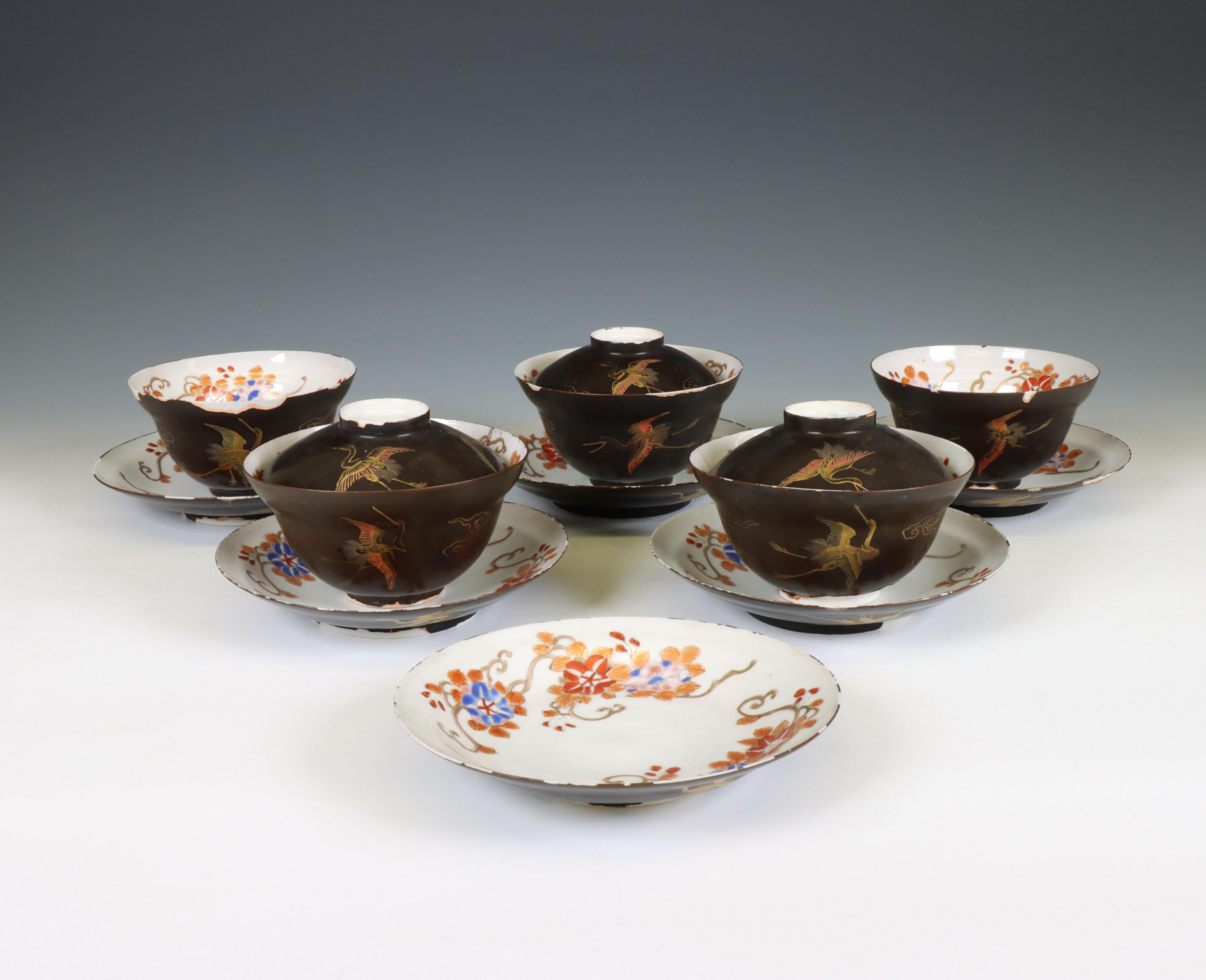 Japan, set of five lacquer-decorated porcelain cups, six saucers, and three covers, Meiji period (1868-1912),