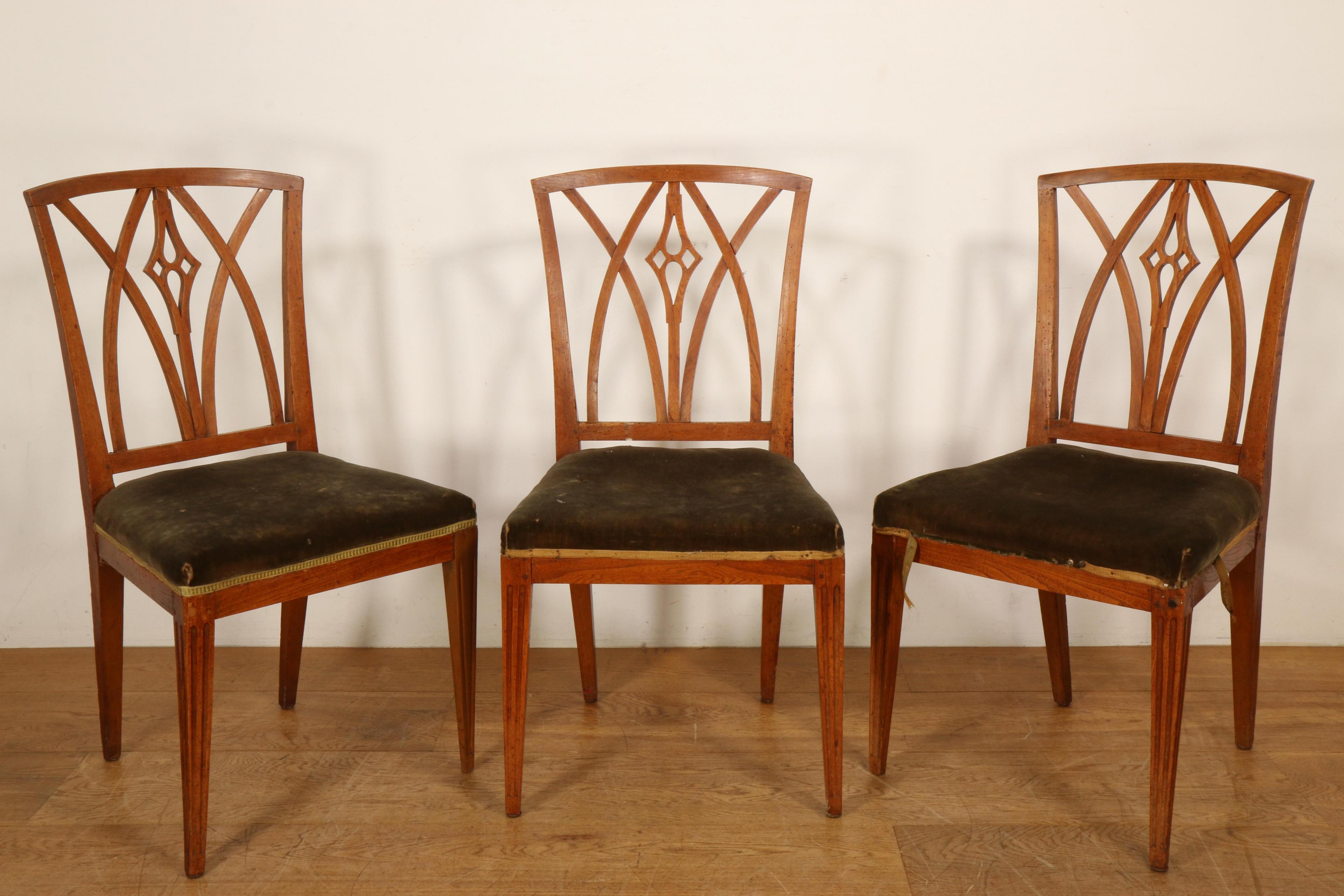 Set van vijf iepenhouten stoelen en twee -fauteuils, Louis XVI.