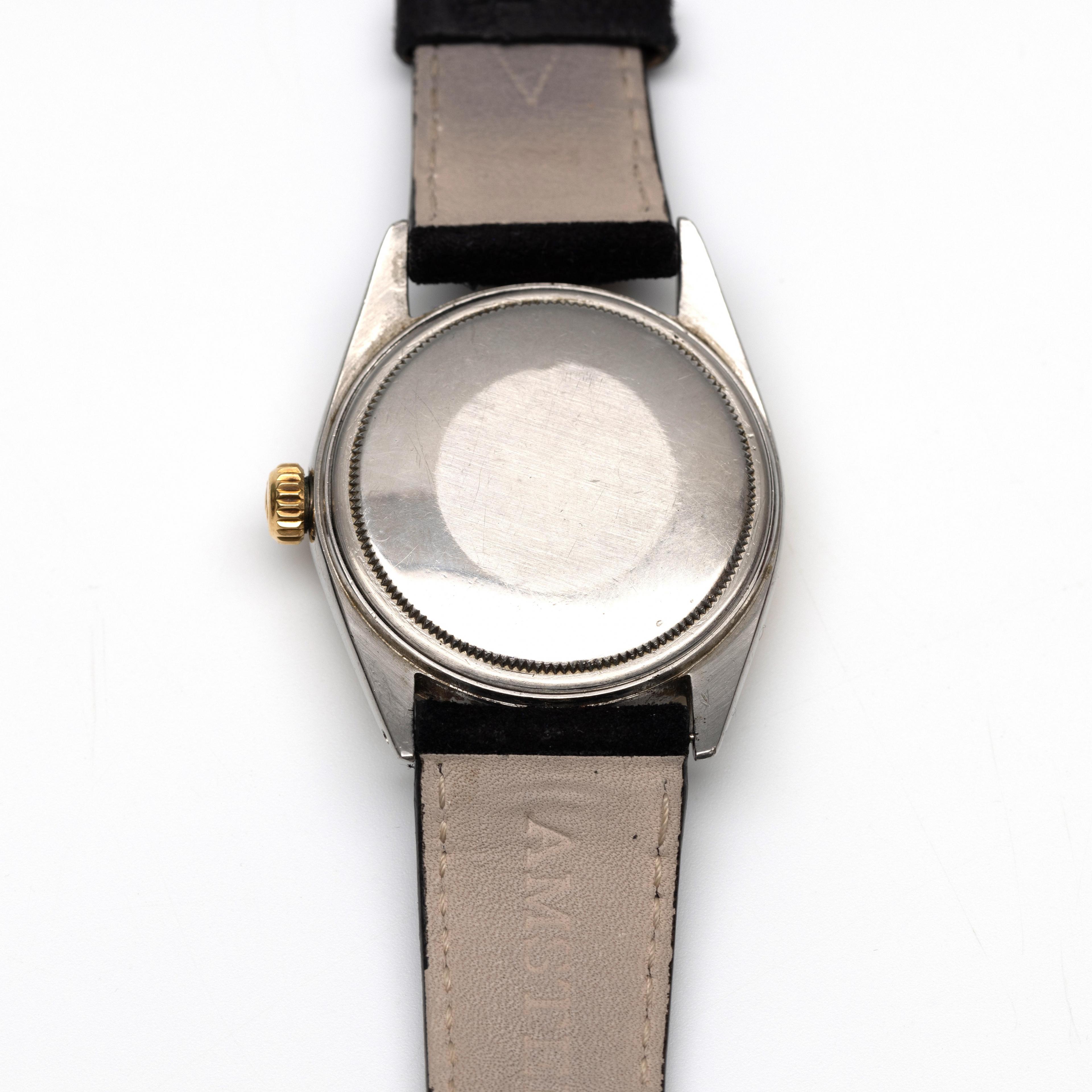 Rolex, steel men's wristwatch, automatic. Model Datejust, ref. 1601. With yellow gold bezel and black dial. Serial number 702876 for 1961. On a black suede strap, not original.