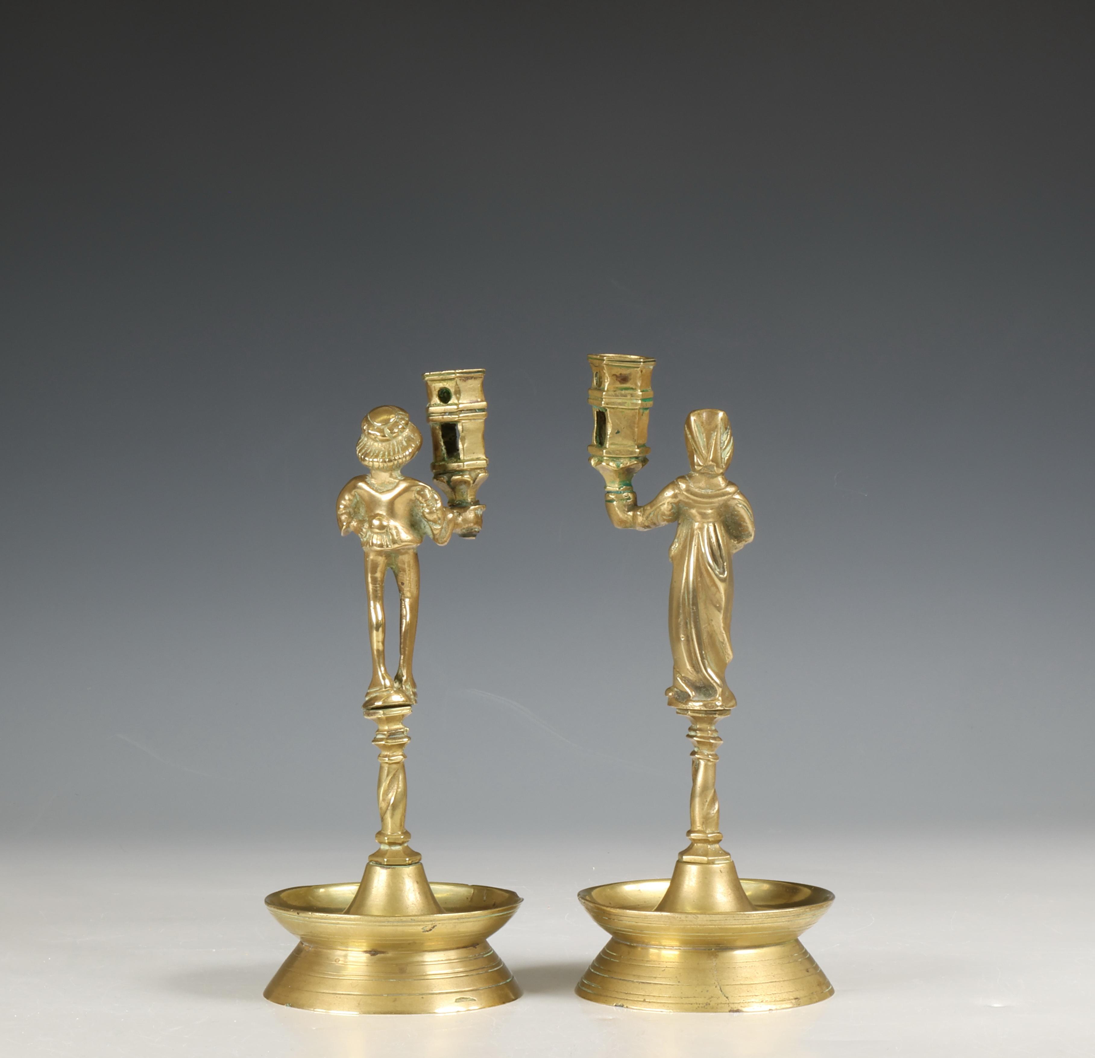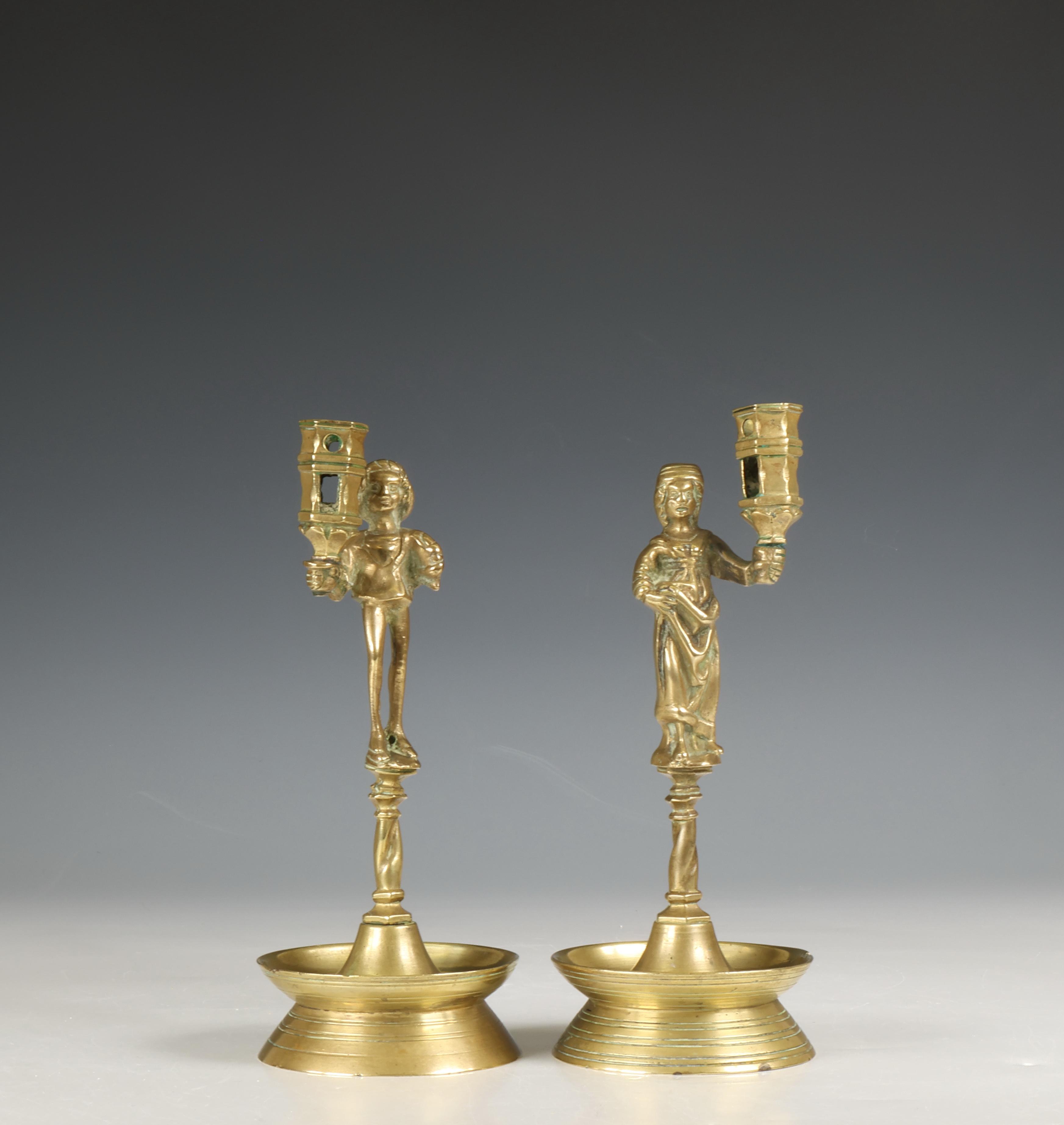 Paar koperen kandelaren in 16e eeuwse stijl;