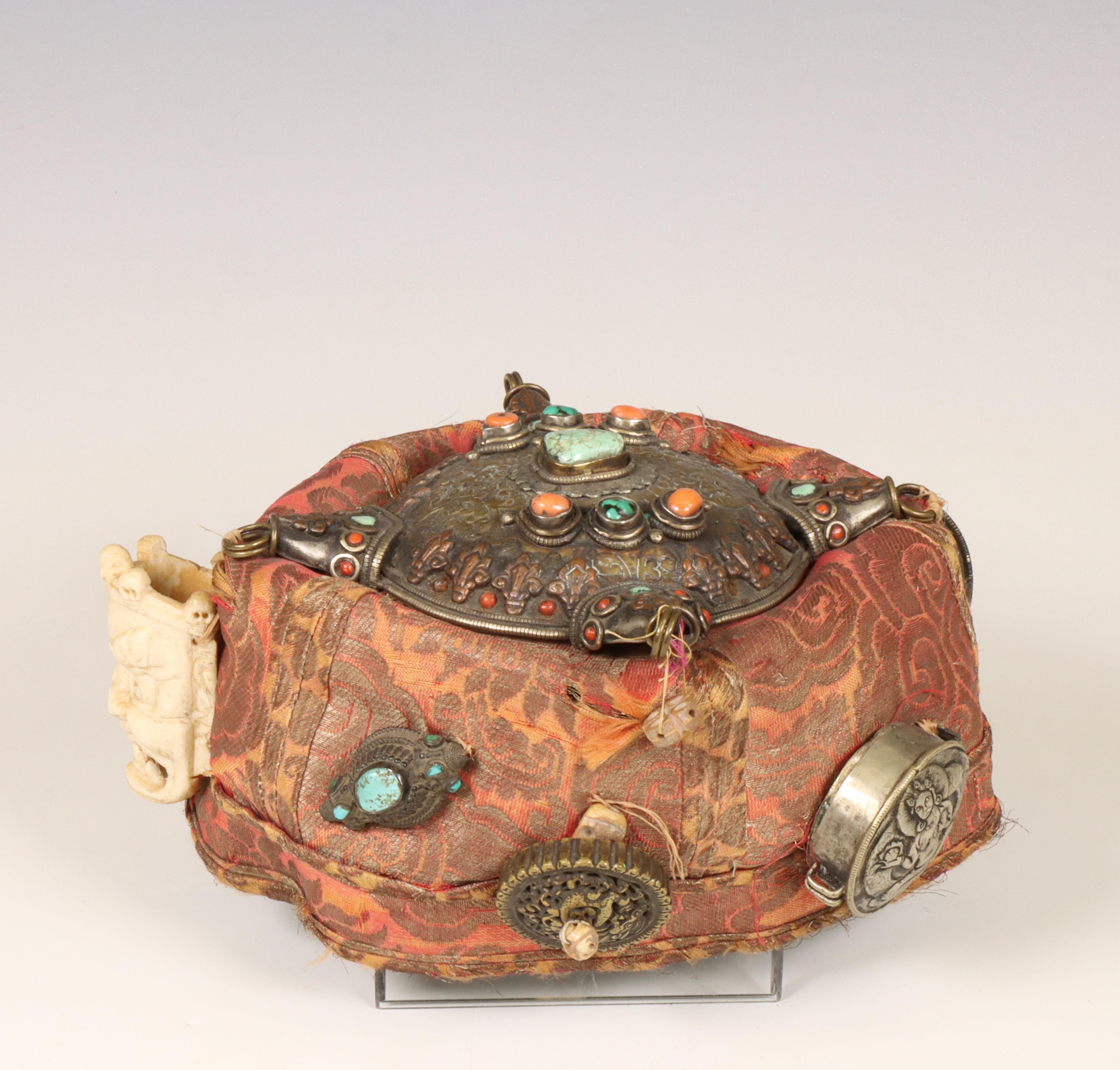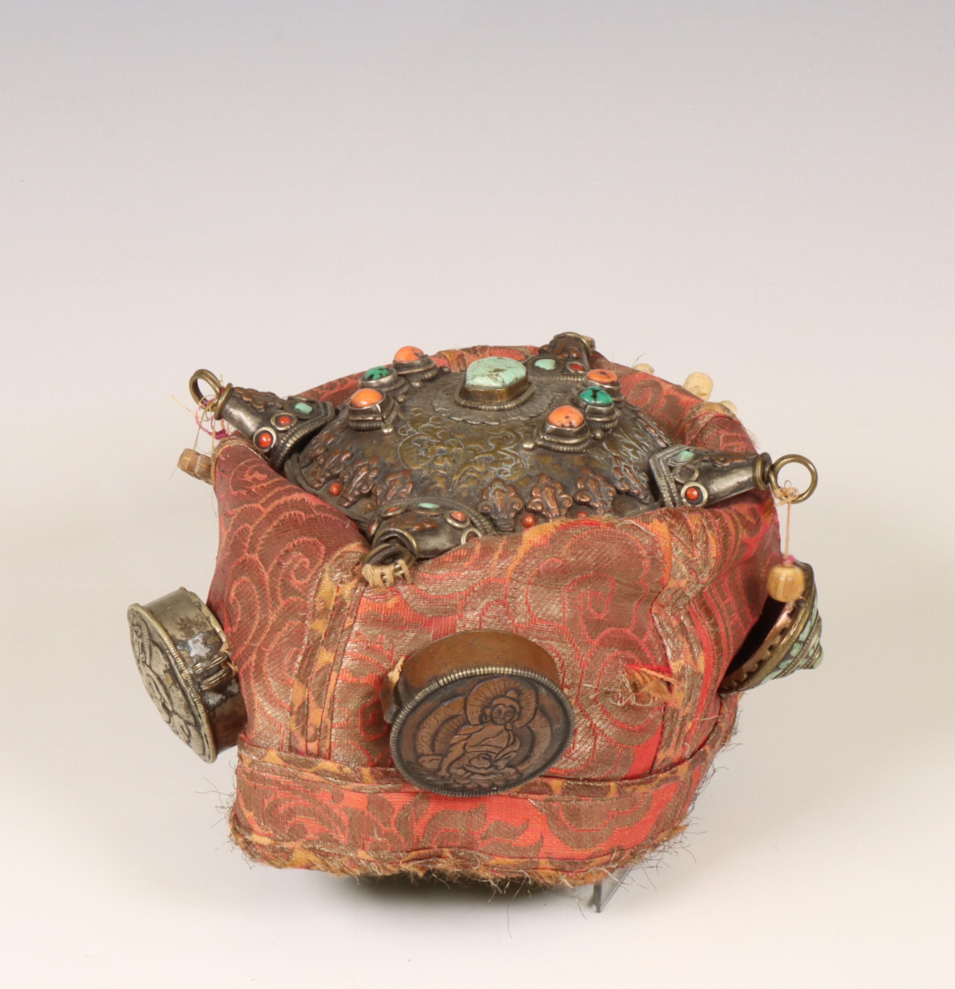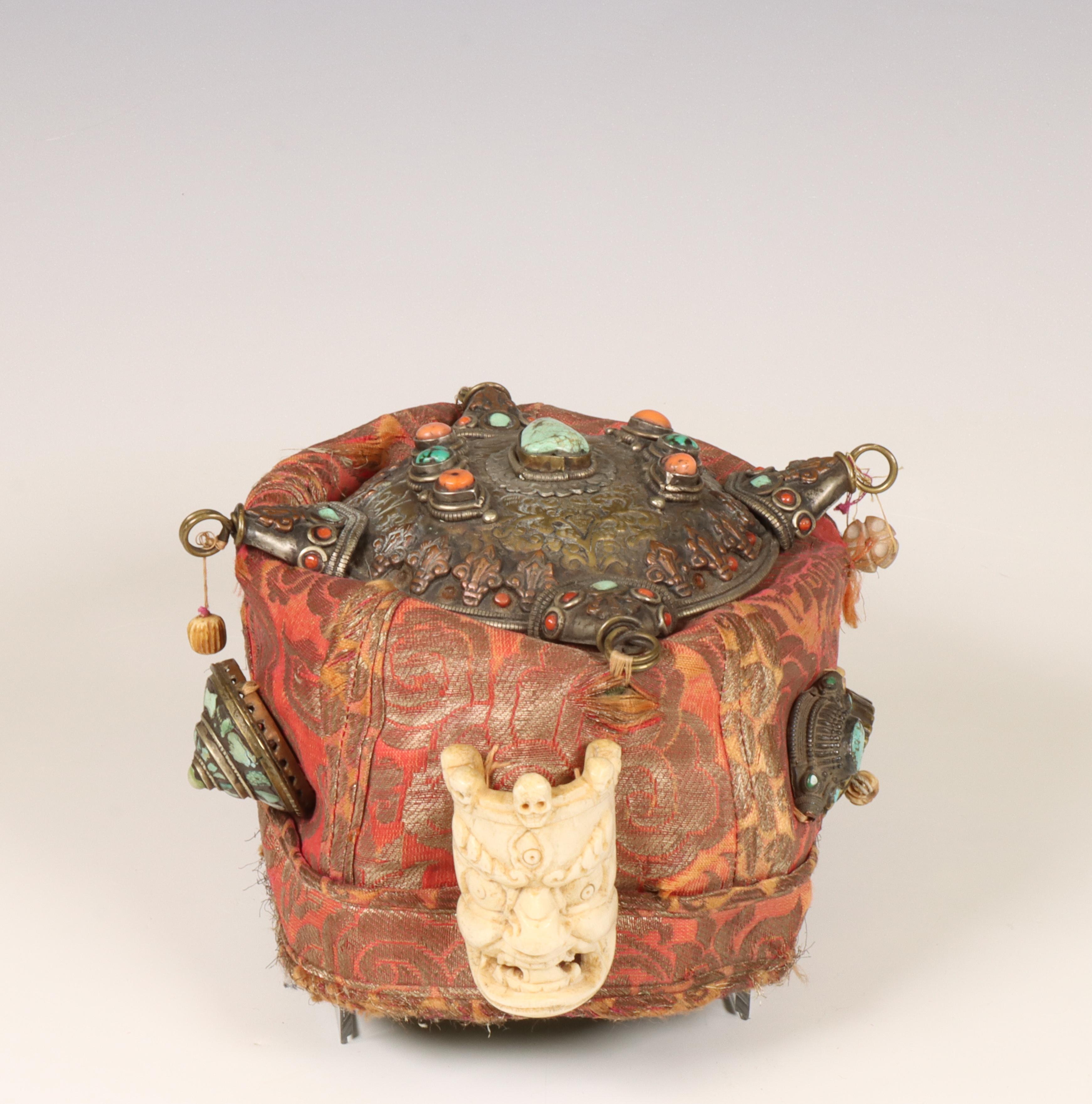 the silk headdress set with turquoise and coral inlaid metal appliques, with bone mask frontispiece (wear and small damages)