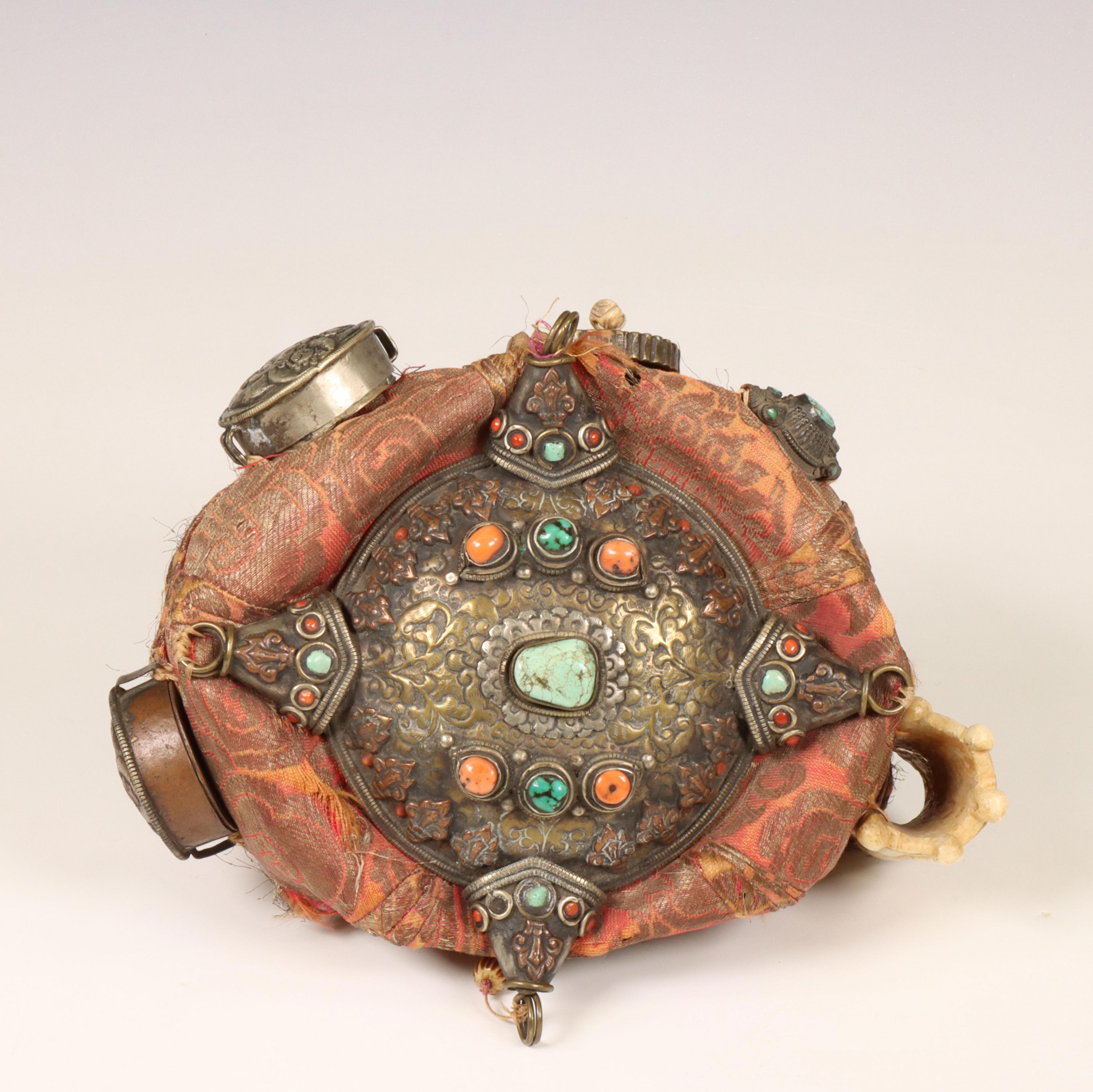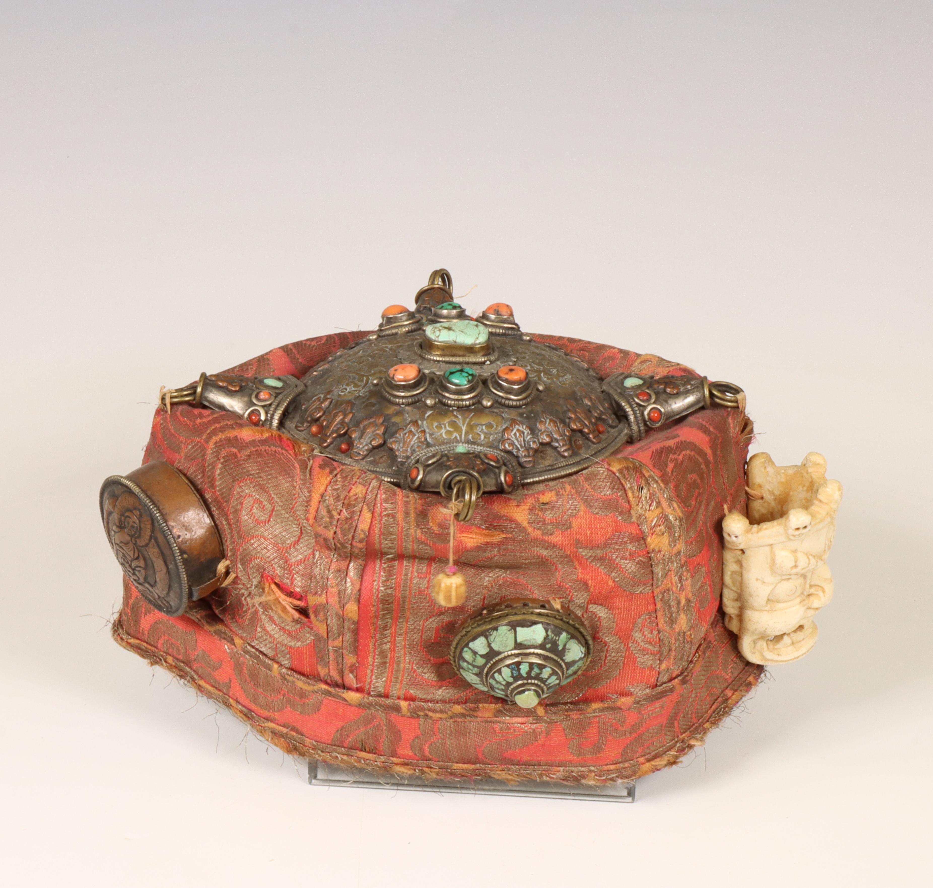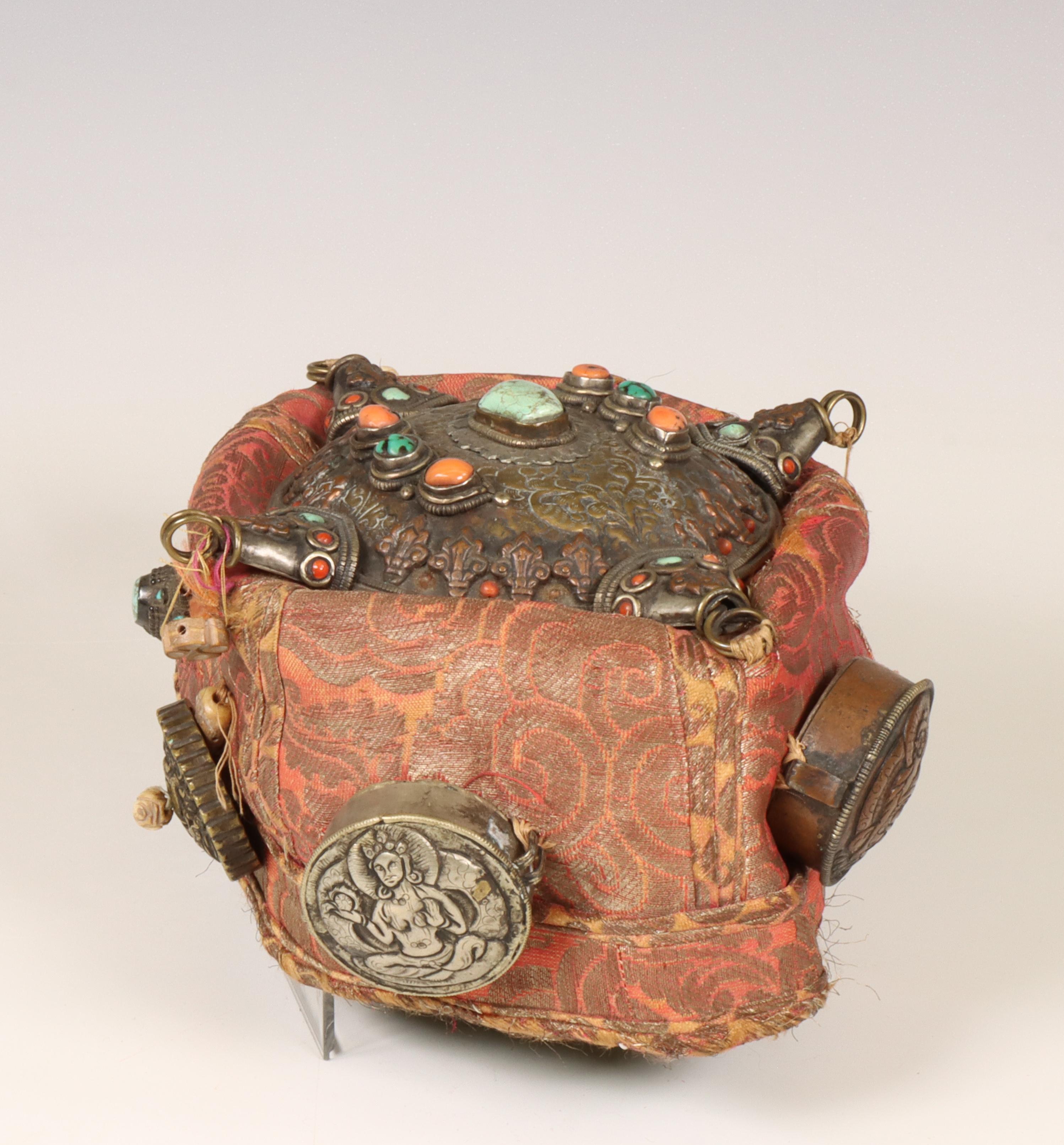 the silk headdress set with turquoise and coral inlaid metal appliques, with bone mask frontispiece (wear and small damages)