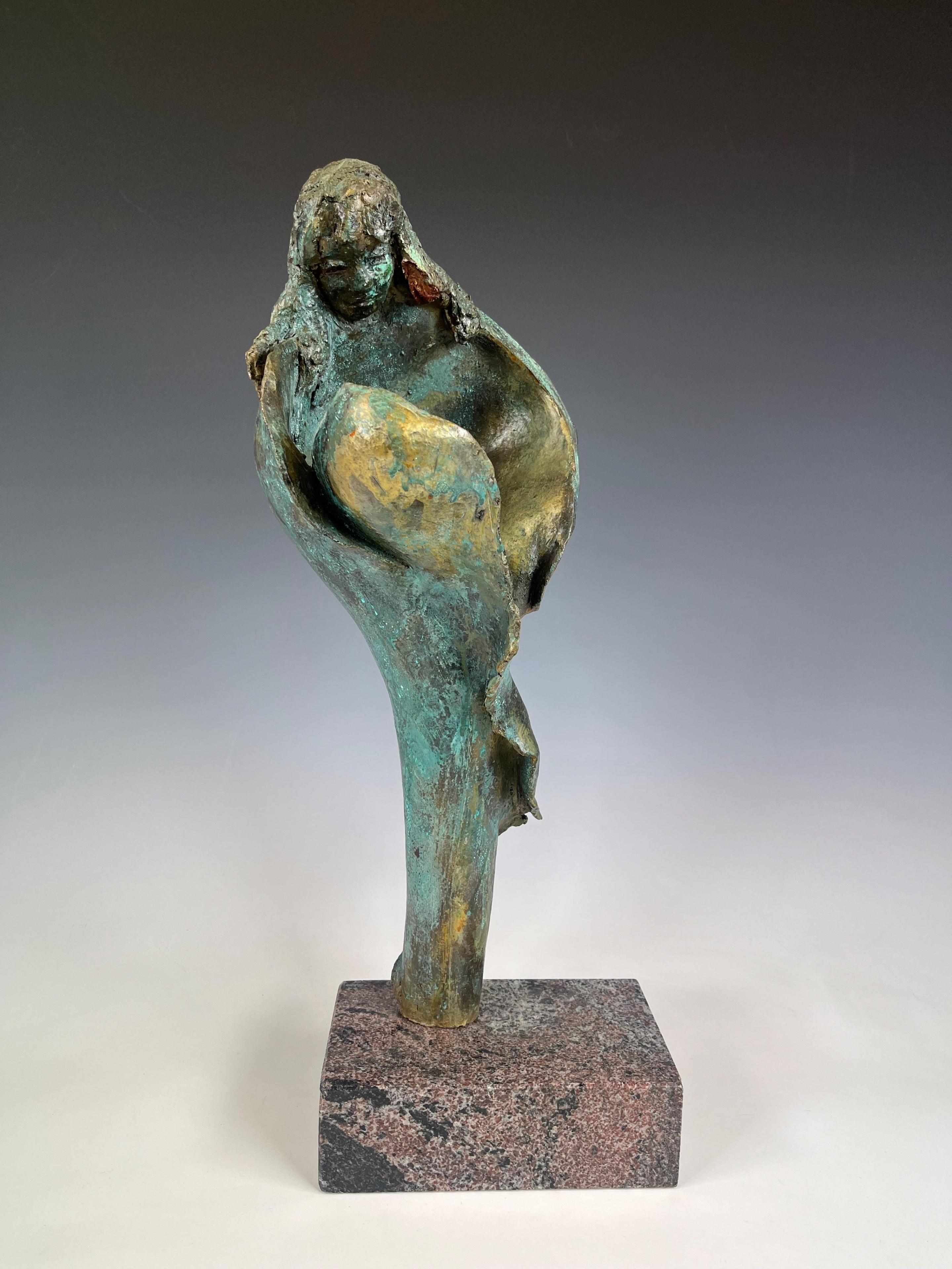 Onbekend, bronzen sculptuur, moeder met kind op stenen sokkel.