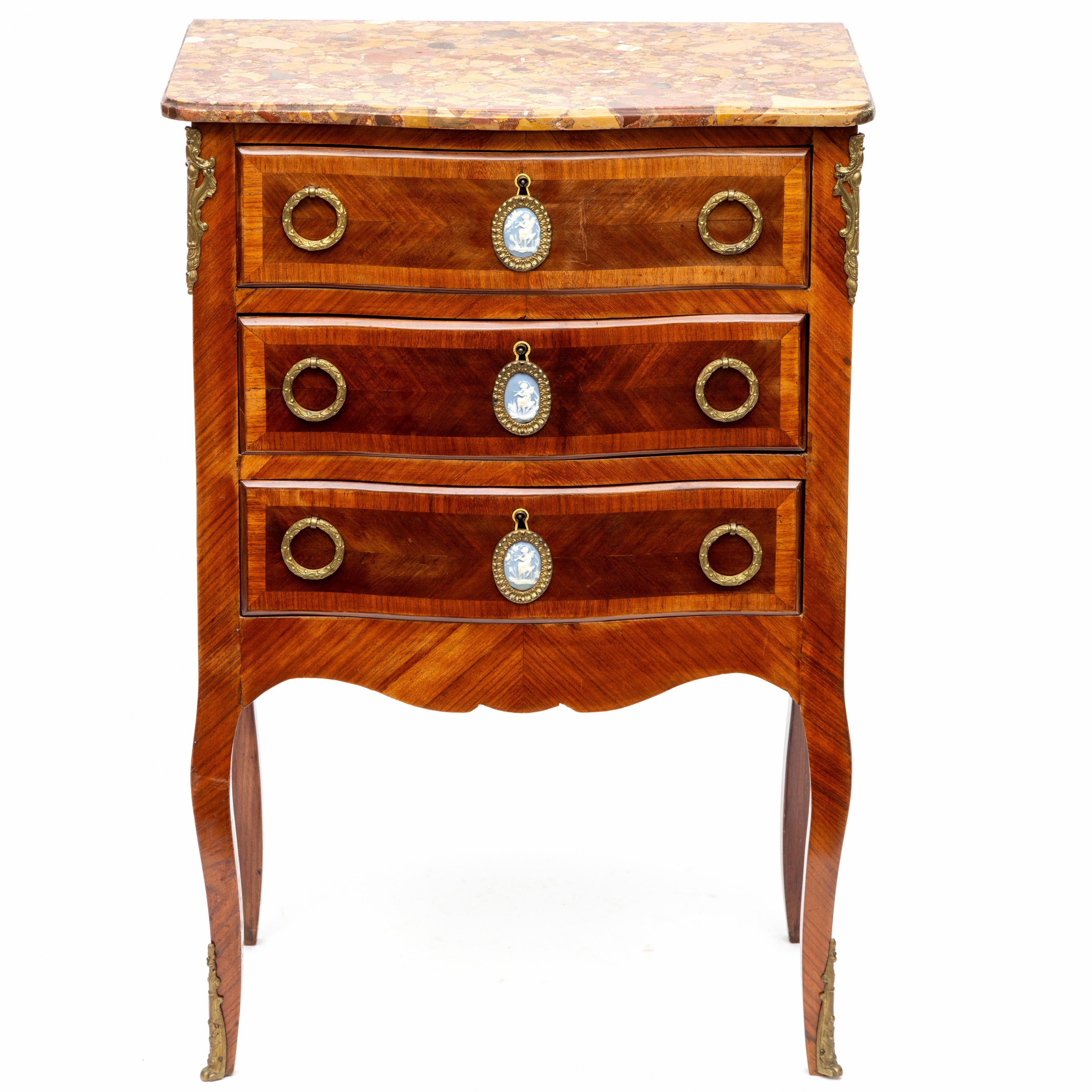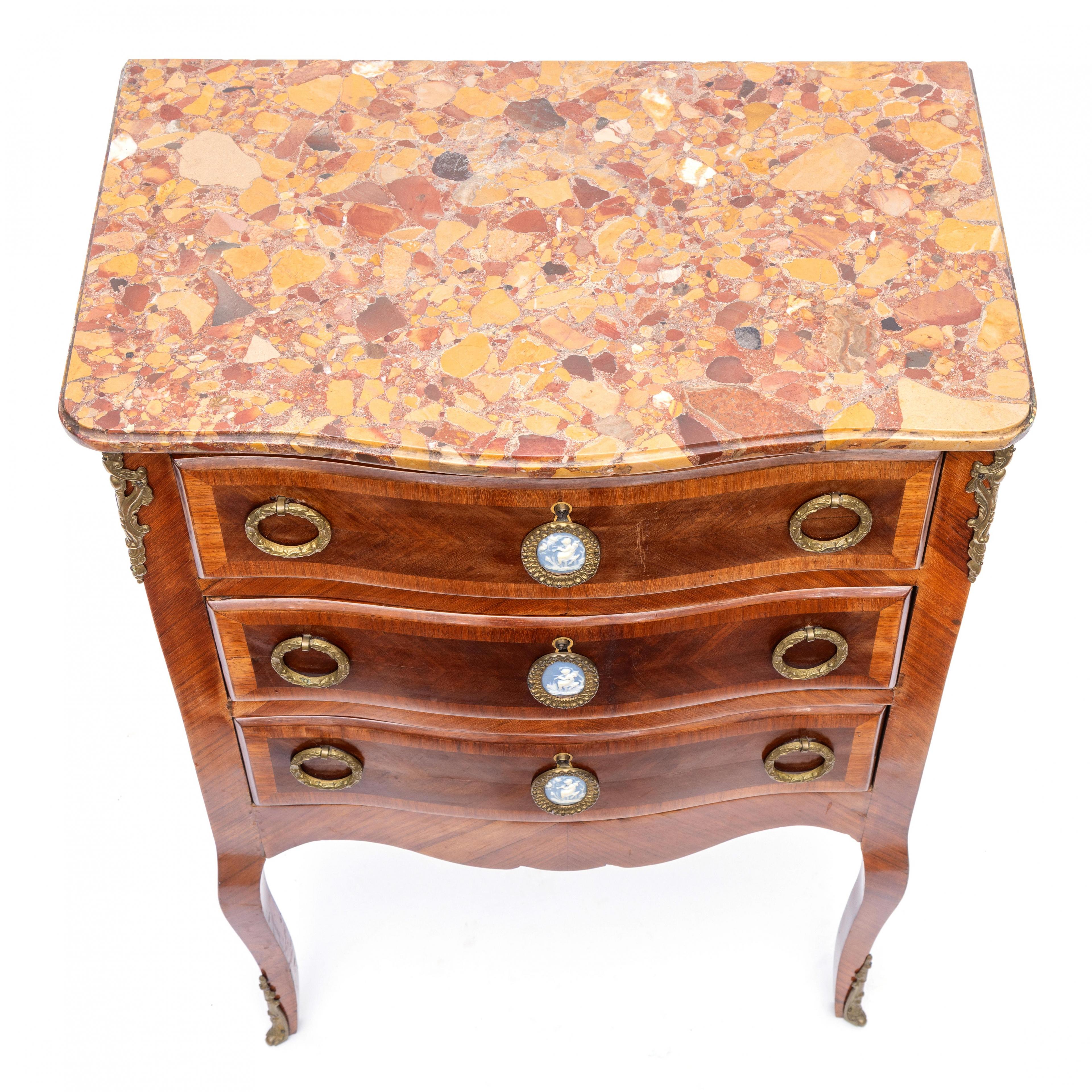 met brèche d' Alep marmeren blad. In het gebogen front drie laden, alle met biscuit ovaaltjes en verguld bronzen beslag