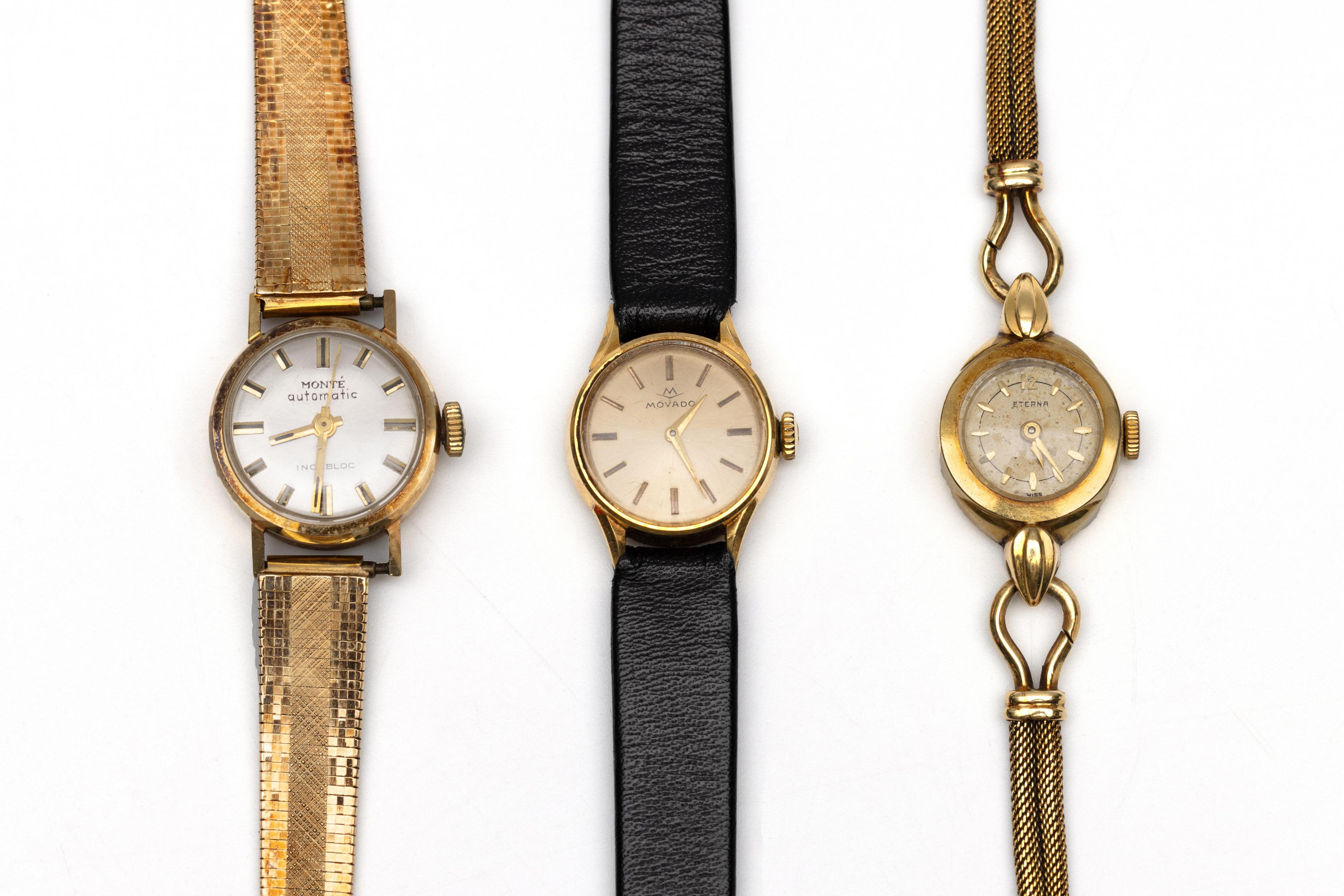 Three gold ladies wristwatches; Eterna, 18 k. gold mechanical watch on a 14 k. gold strap (does not run), Monté, 14 k. gold automatic, on a 14 k. gold strap and Movado, 18 k. gold mechanical watch on a black leather strap, in case