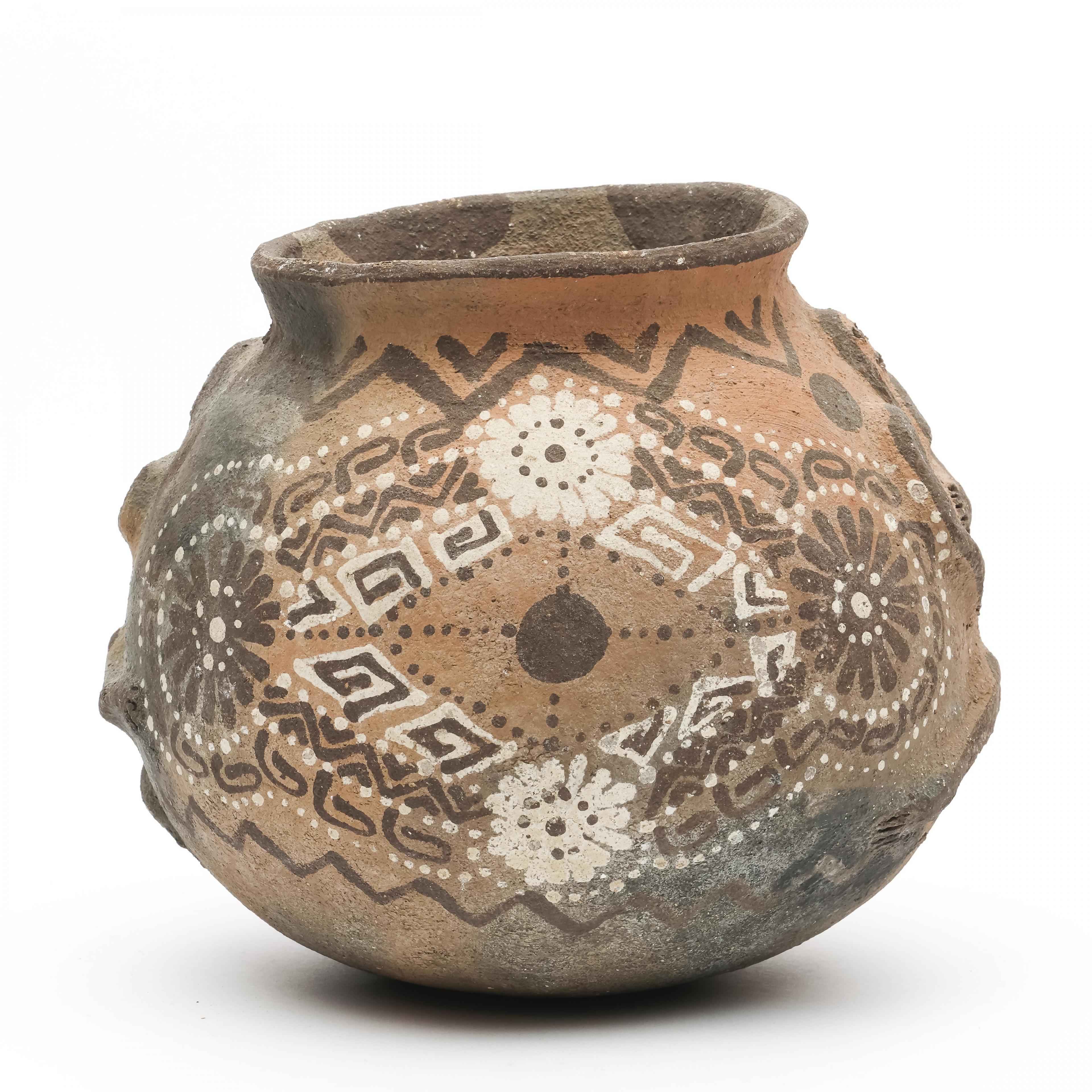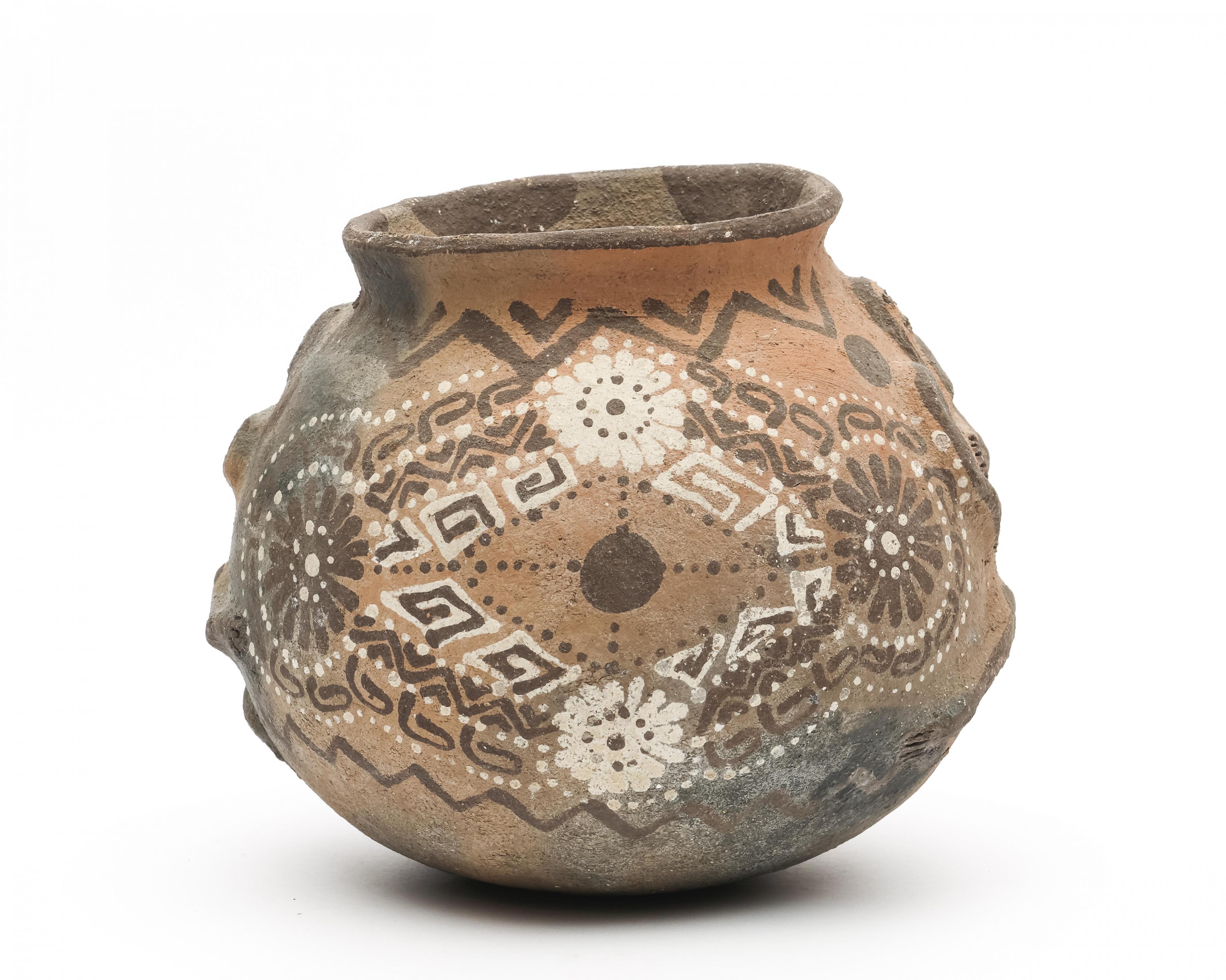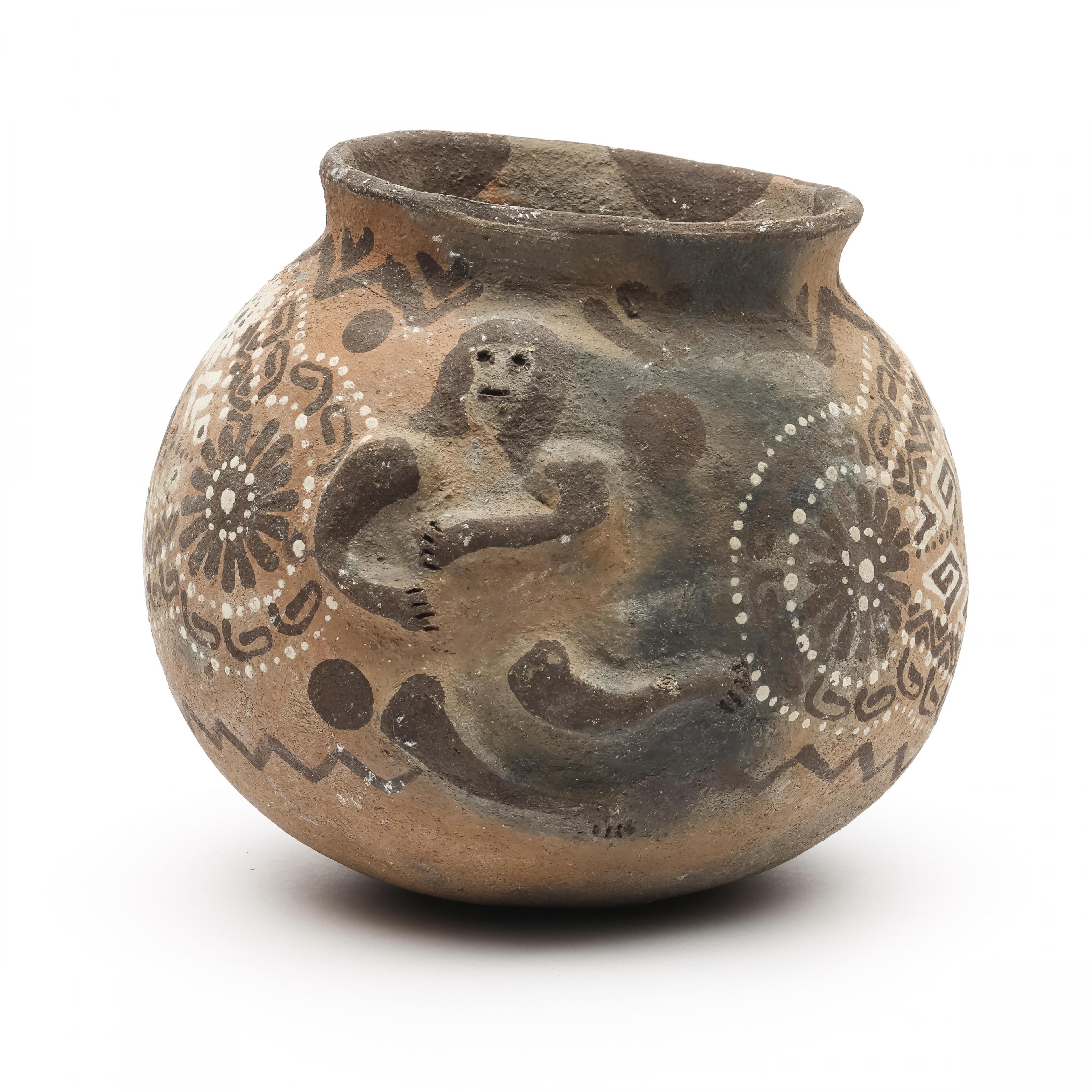 of squat globular shape with dancing figures in relief alternating with a painted diamond-shaped pattern.