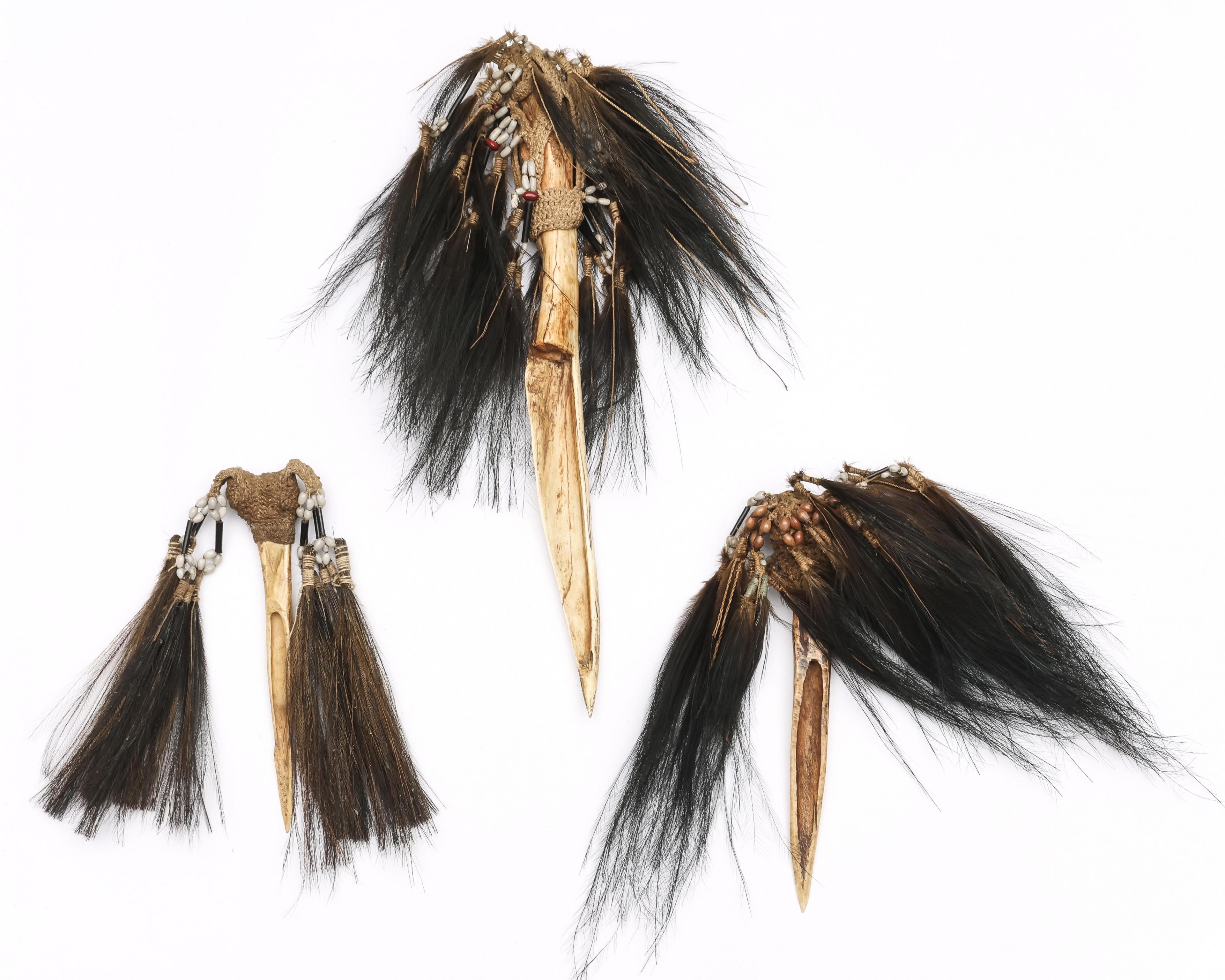 Papua, Asmat, three ritual bone daggers, the largest made of a crocodile's jaw