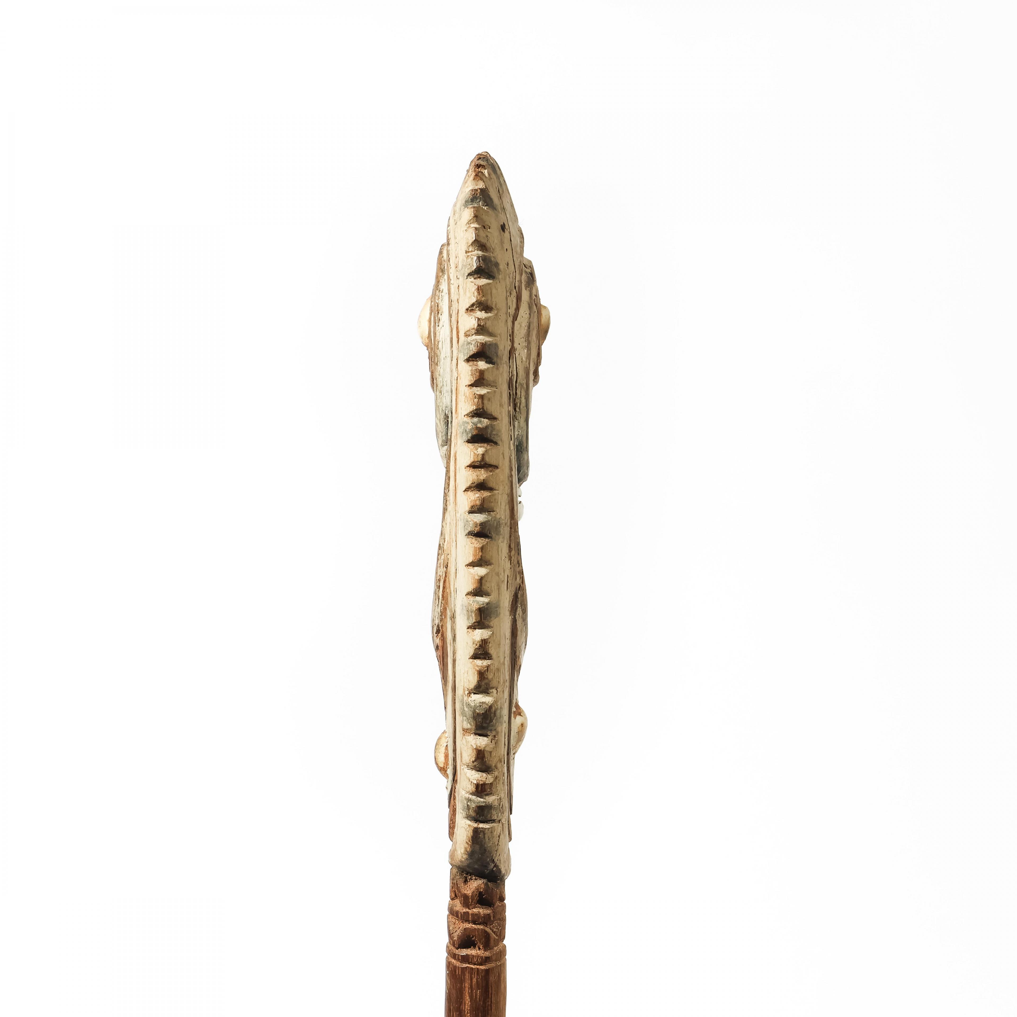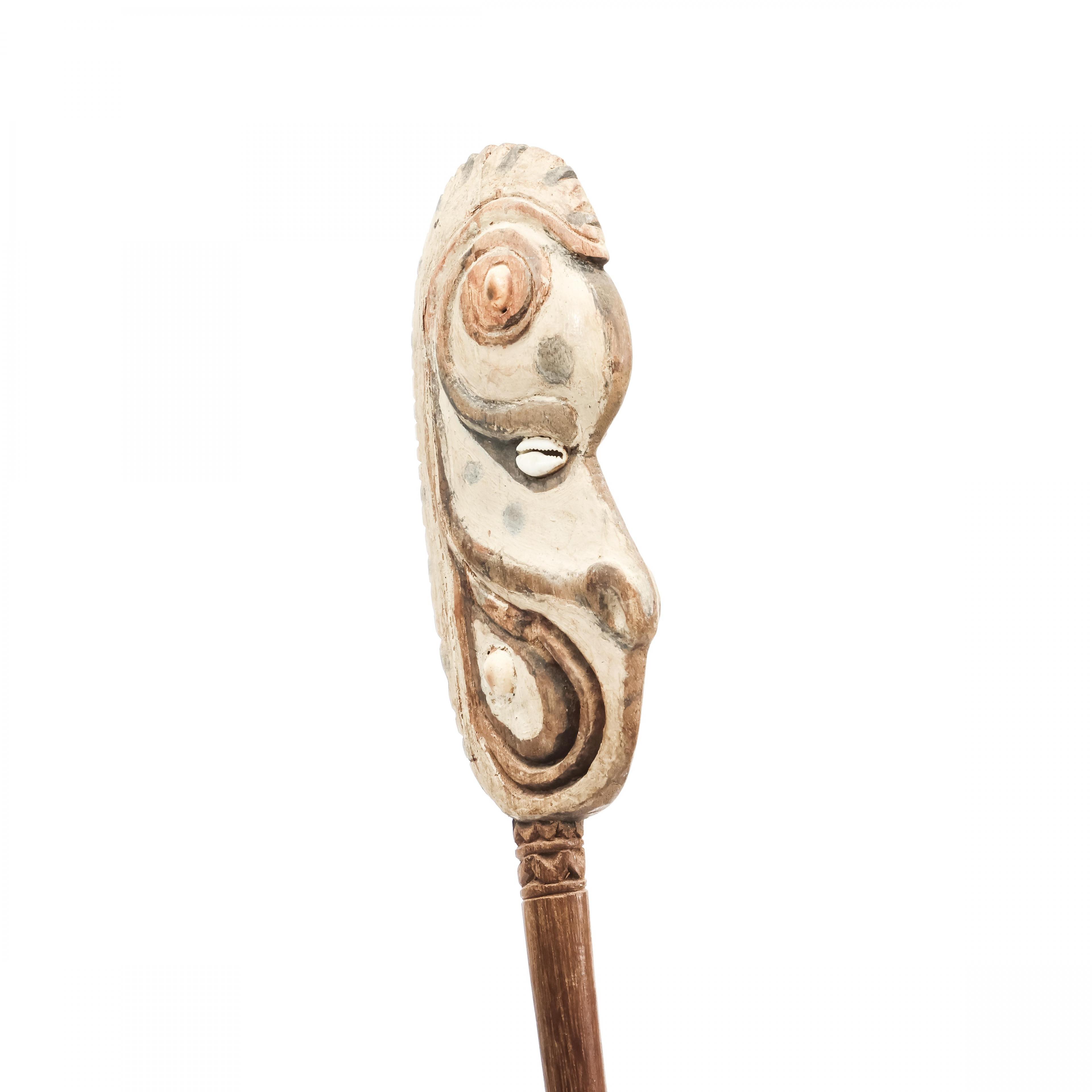 surmounted by a zoo- anthropomorphic flat head with shell inlay.