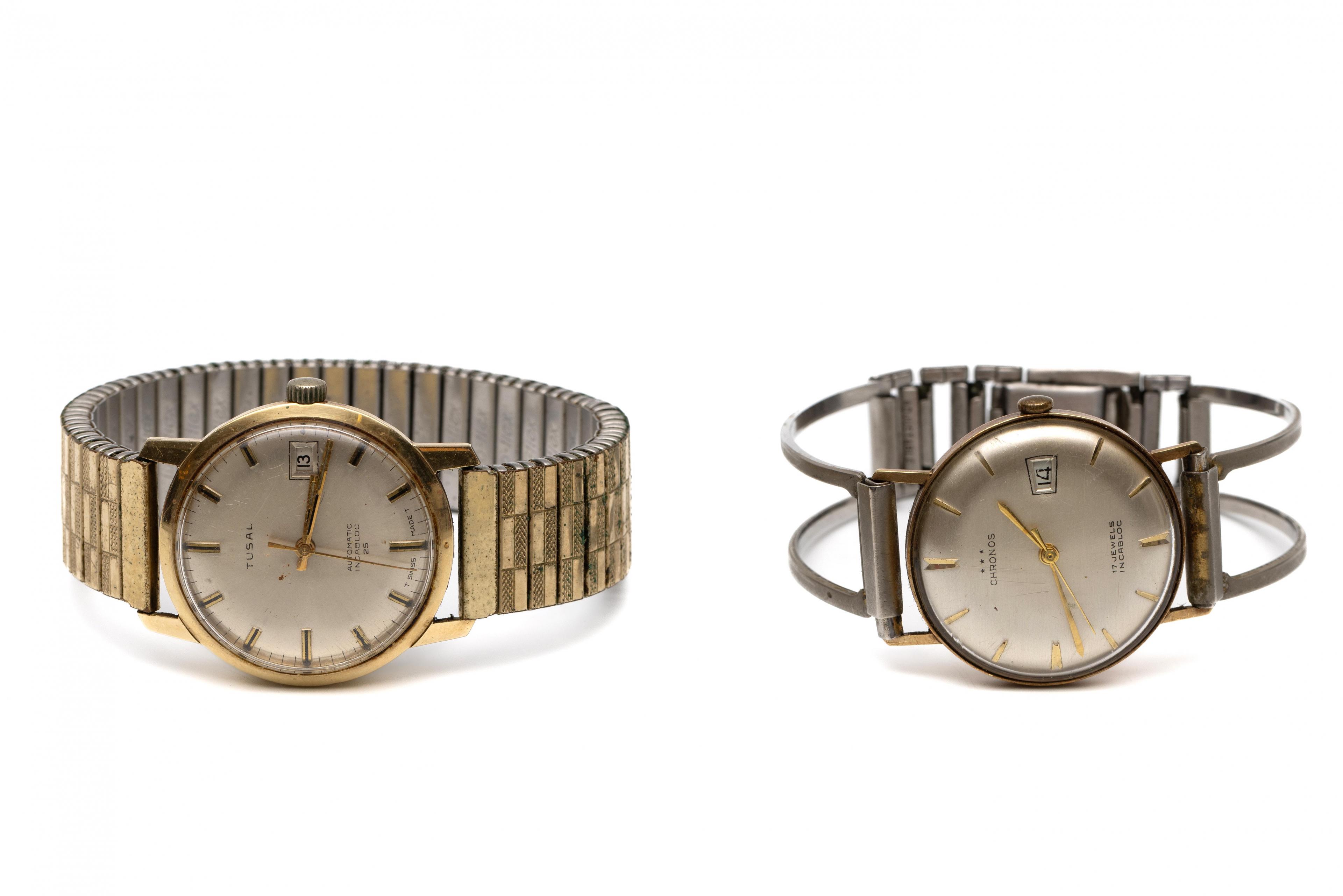 Two 14 k. gold men's wristwatches, automatic, Tusal and Chronos. Both on a stainless steel strap