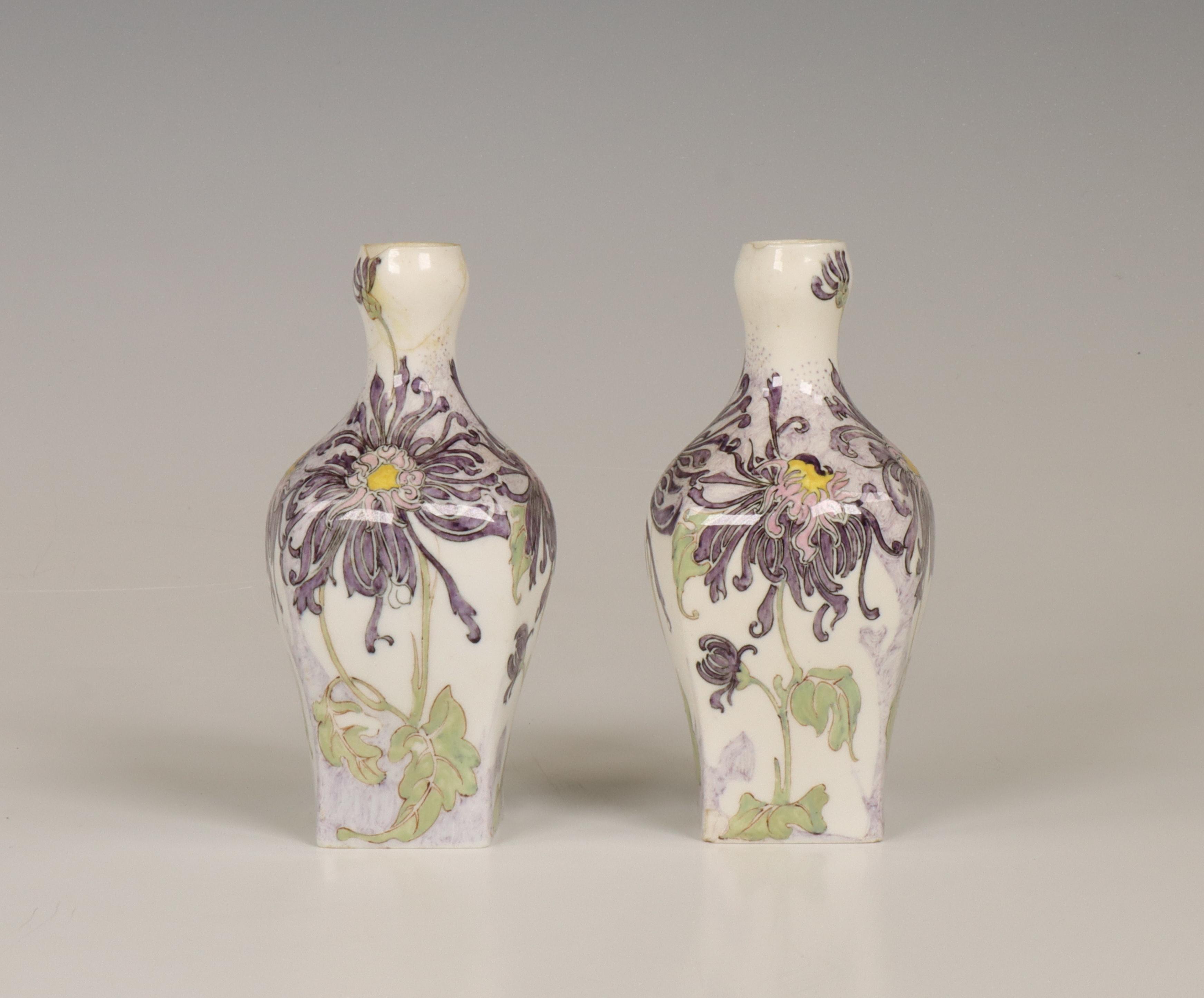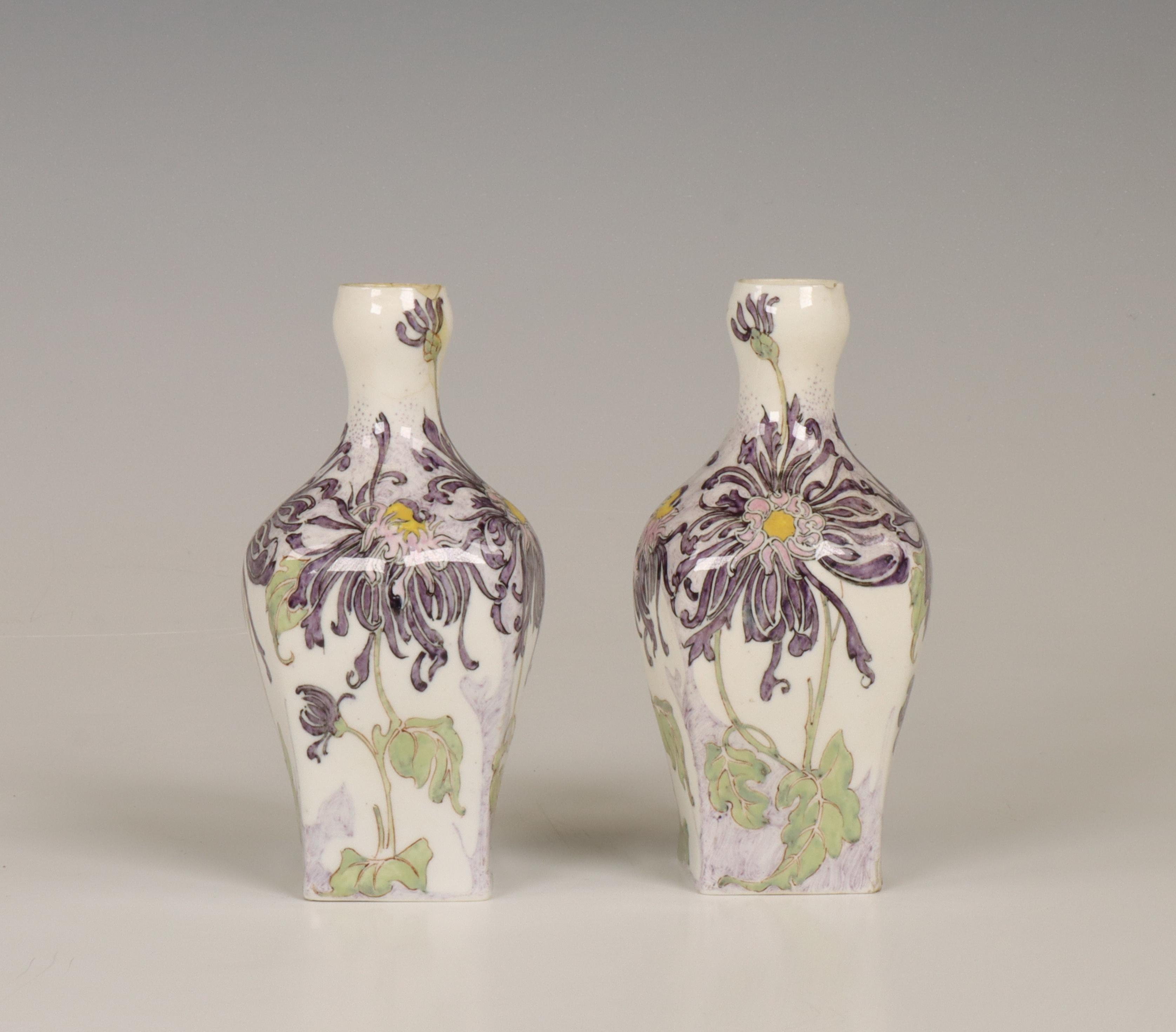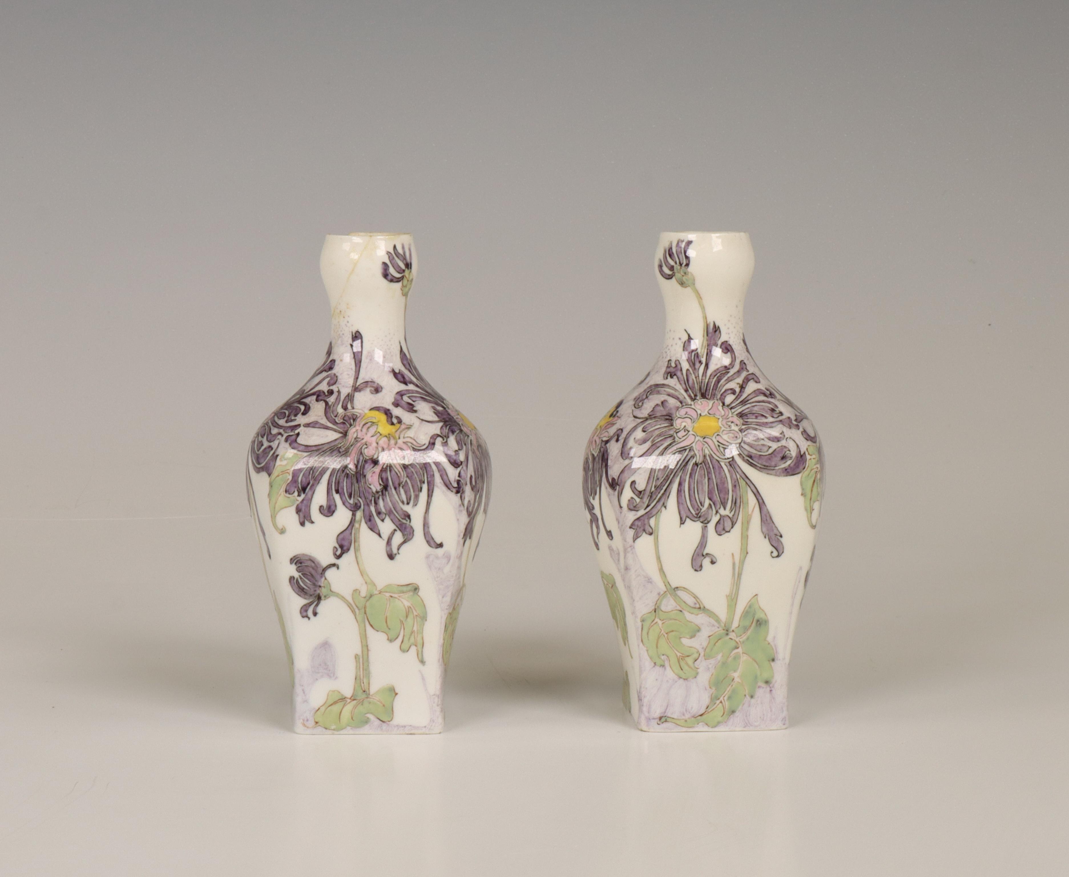 N.V. Haagsche Plateelfabriek Rozenburg, paar eierschaal porseleinen vaasjes, schilder Sam Schellink, 1905.