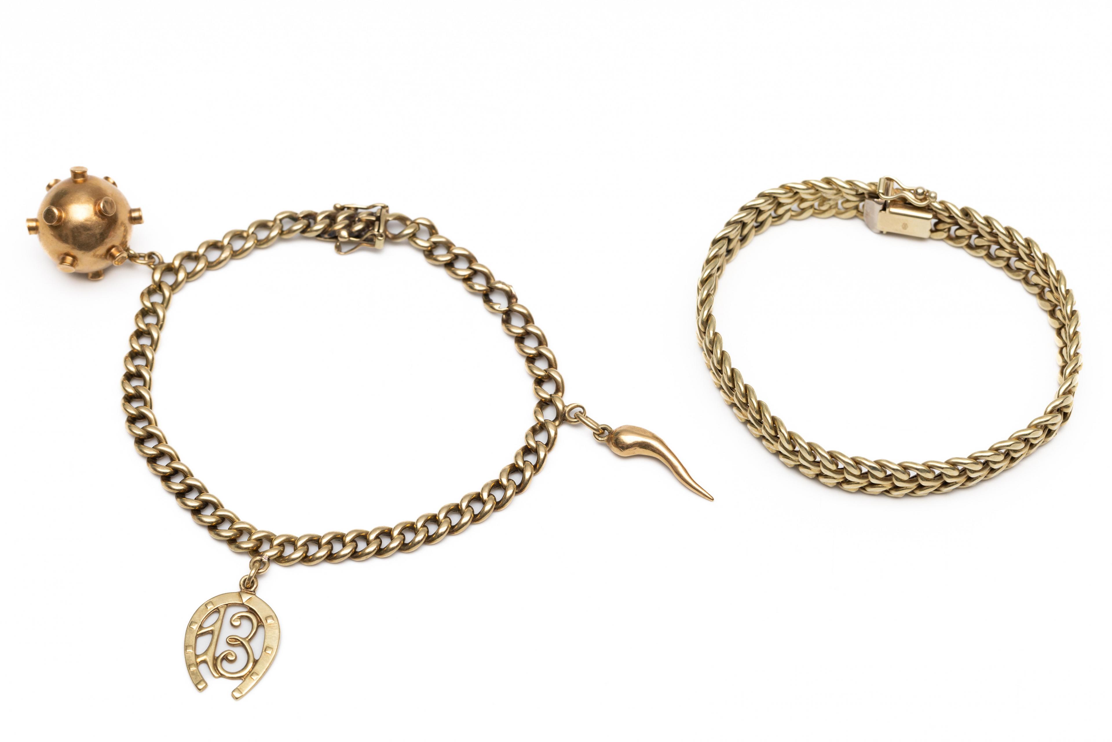 Two 14 k. gold bracelets. One curb link bracelet with three charms; sputnik, horseshoe and lucky carrot and one curb link bracelet (a piece of link is loose)